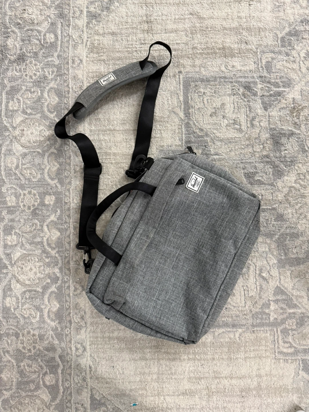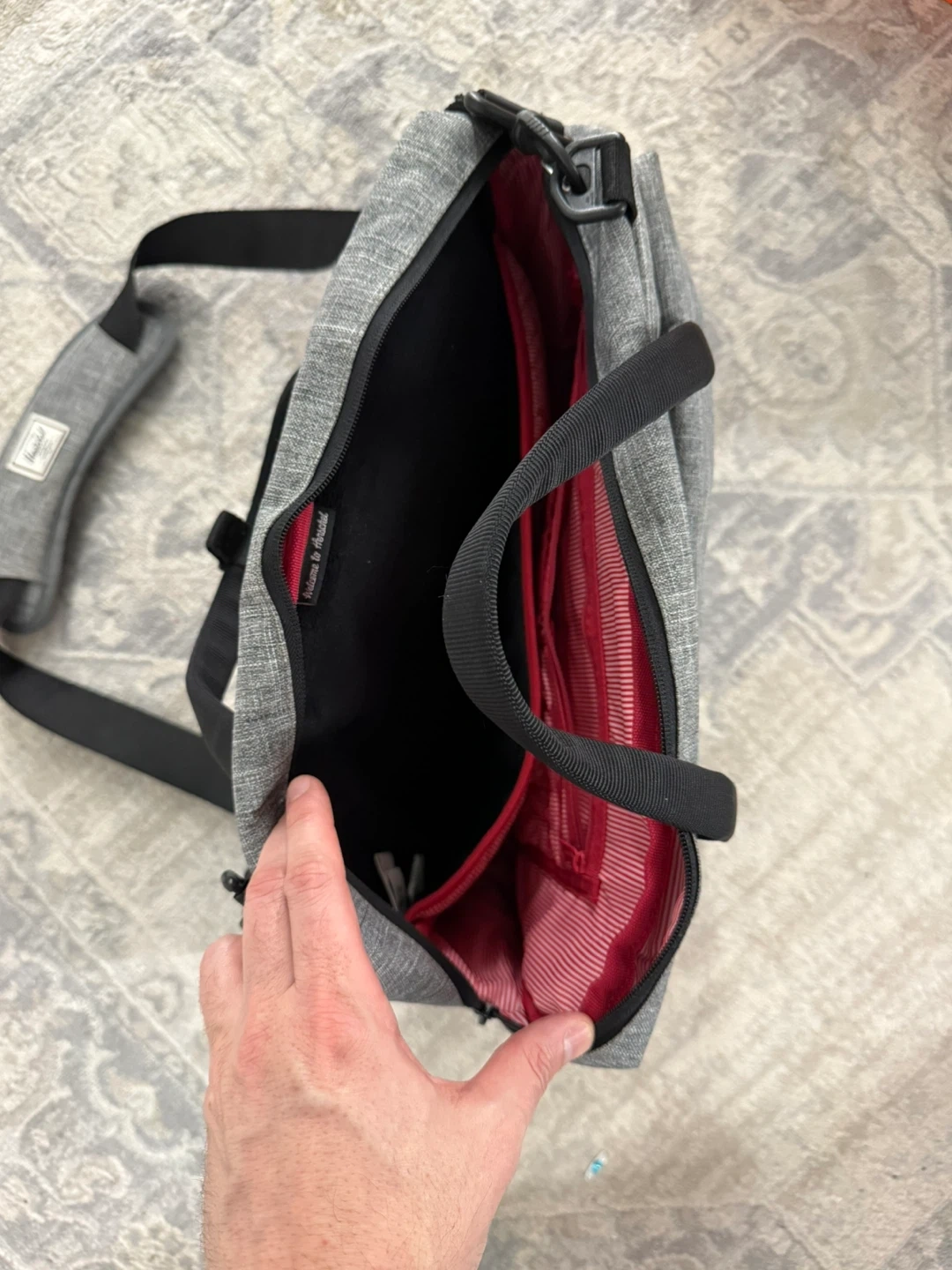 Looking to sell this Herschel Supply Co. messenger bag! It's in great condition and perfect for carrying your essentials around town. The bag features a comfortable shoulder strap and a spacious interior with red accents. It's a stylish and practical choice for anyone on the go