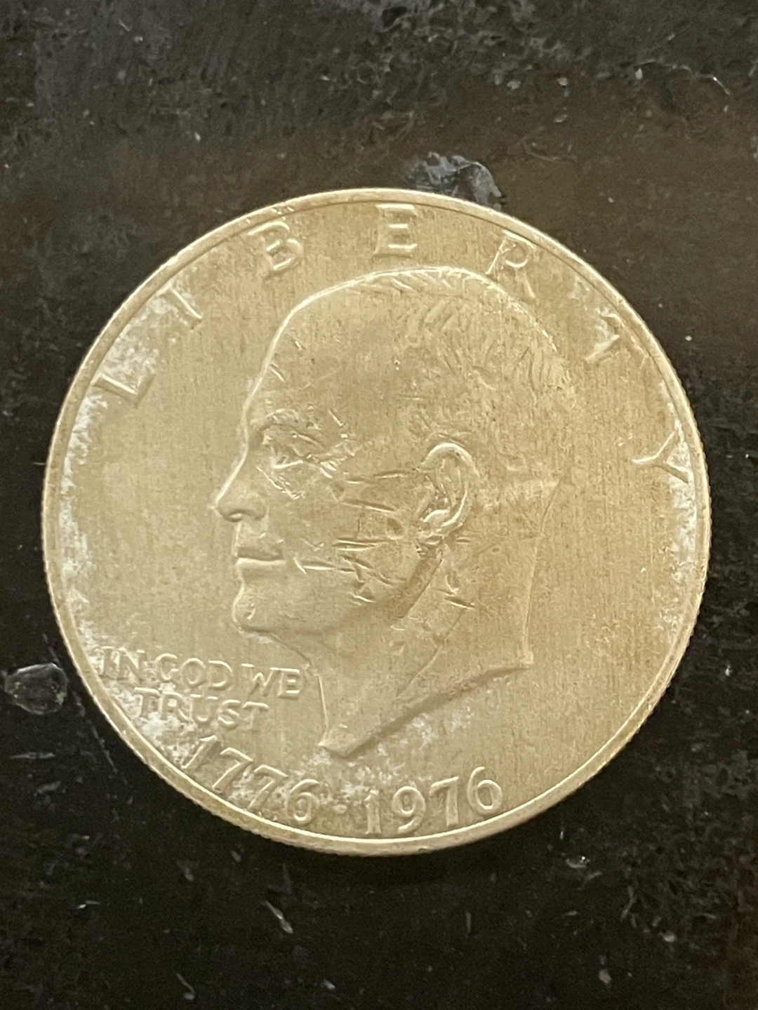 This is a 1976 Eisenhower dollar coin commemorating the U.S. Bicentennial. It features President Eisenhower on one side and the Liberty Bell on the other. A great piece for collectors!