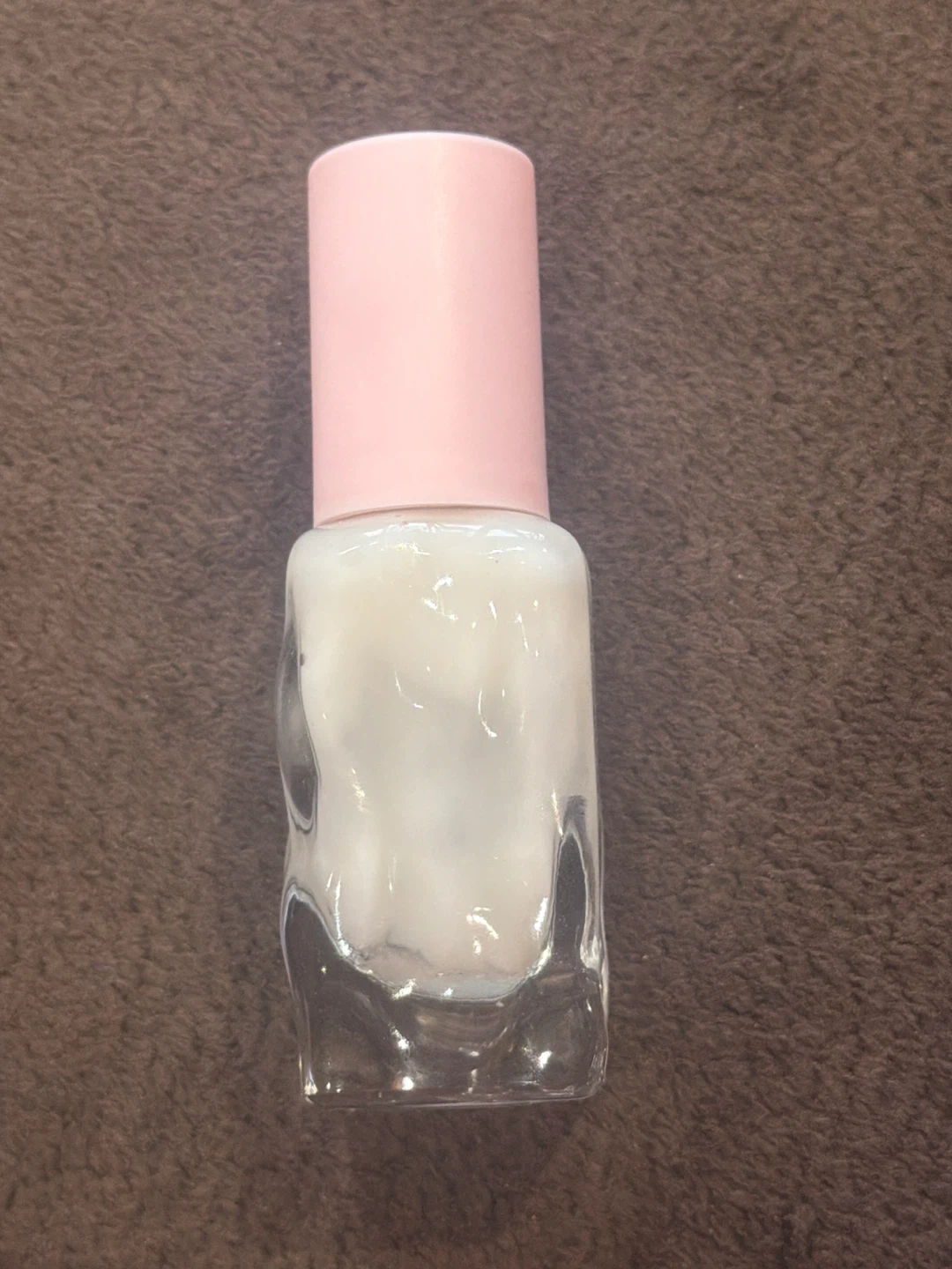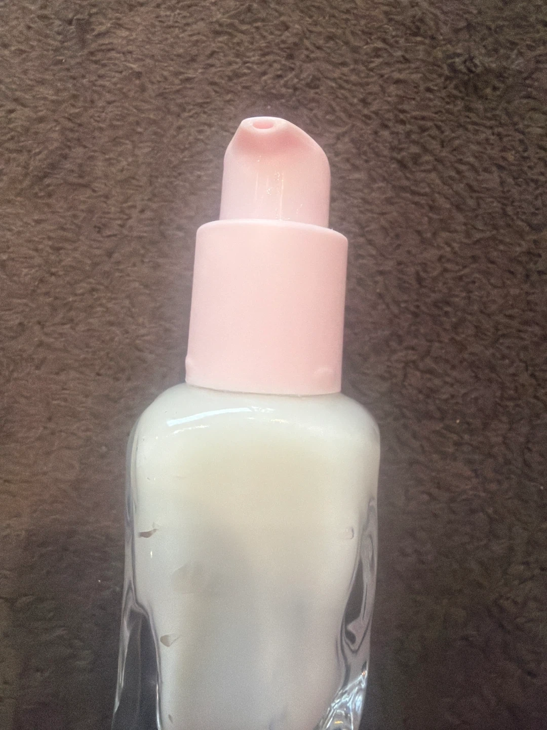 Clear glass bottle with a Aveeno hand cream product inside. It has a pink pump dispenser on top. The bottle has a unique, slightly wavy glass base, and it’s kinda hard to get out but open it if you wanna make it easier.