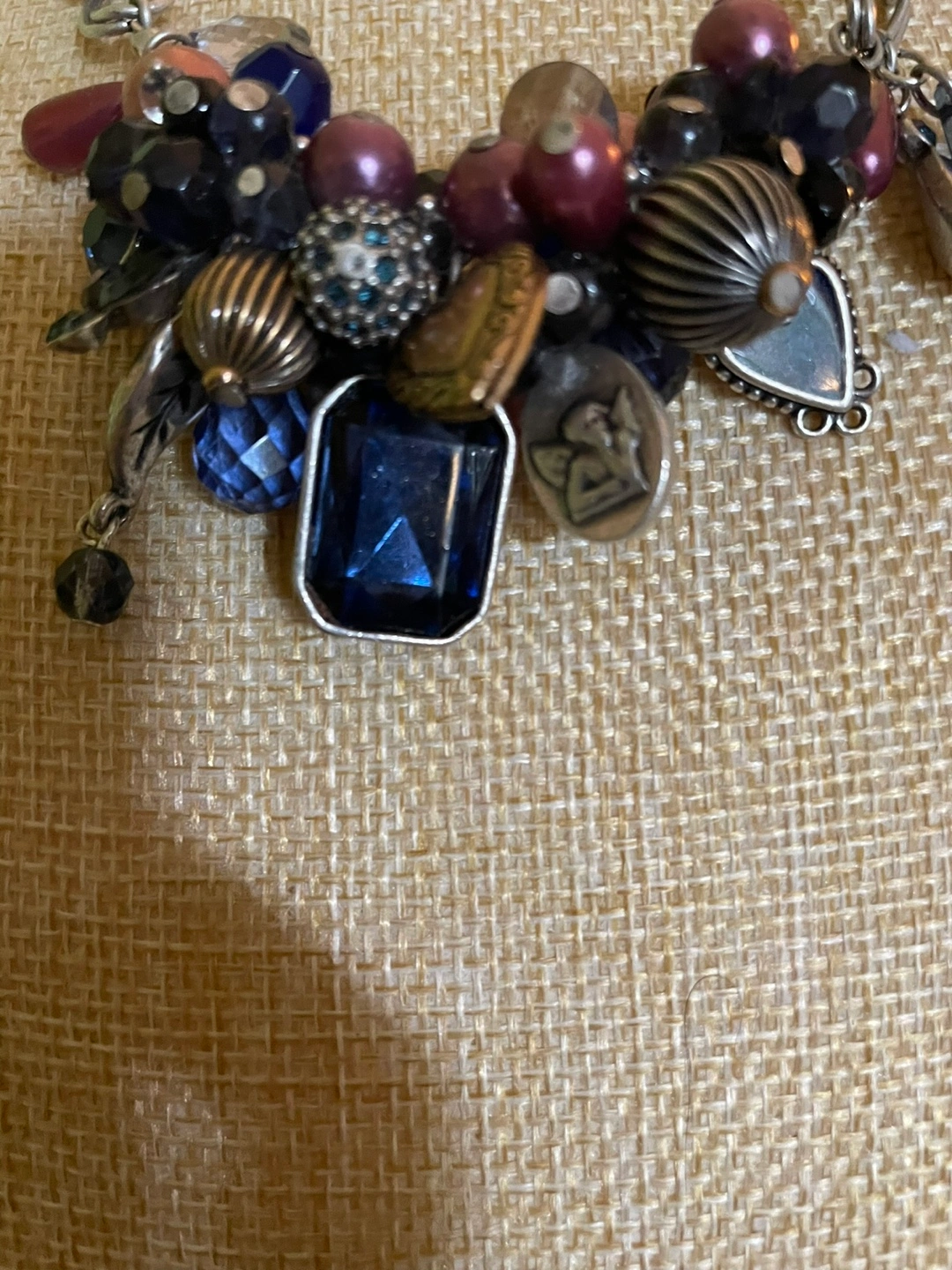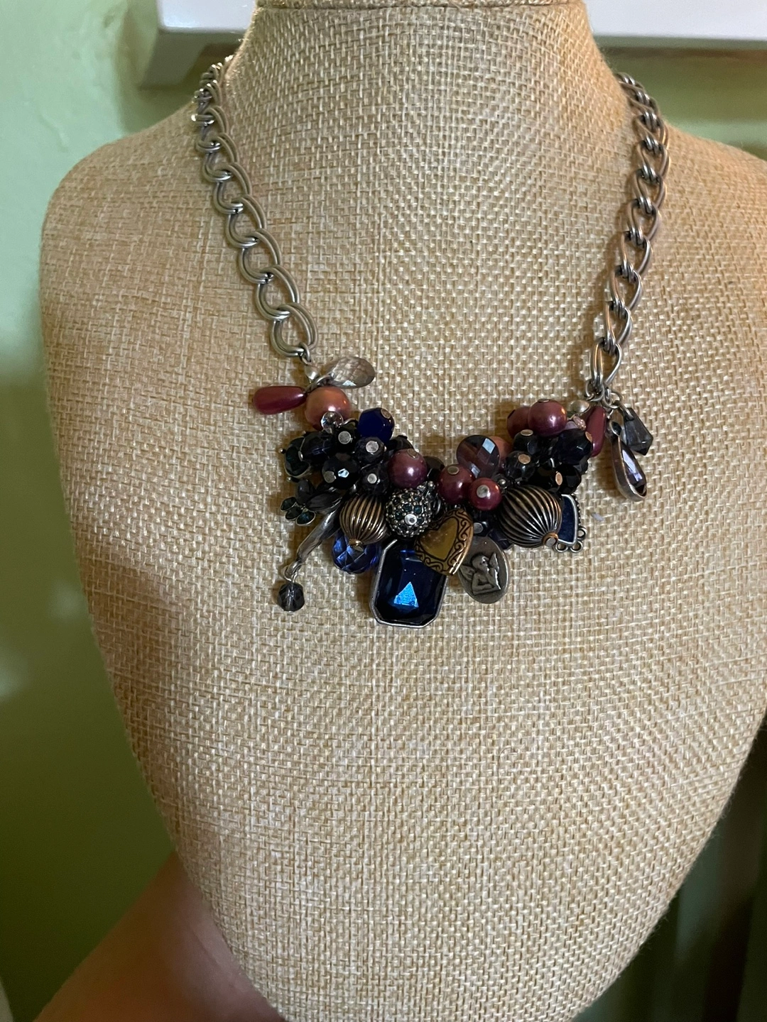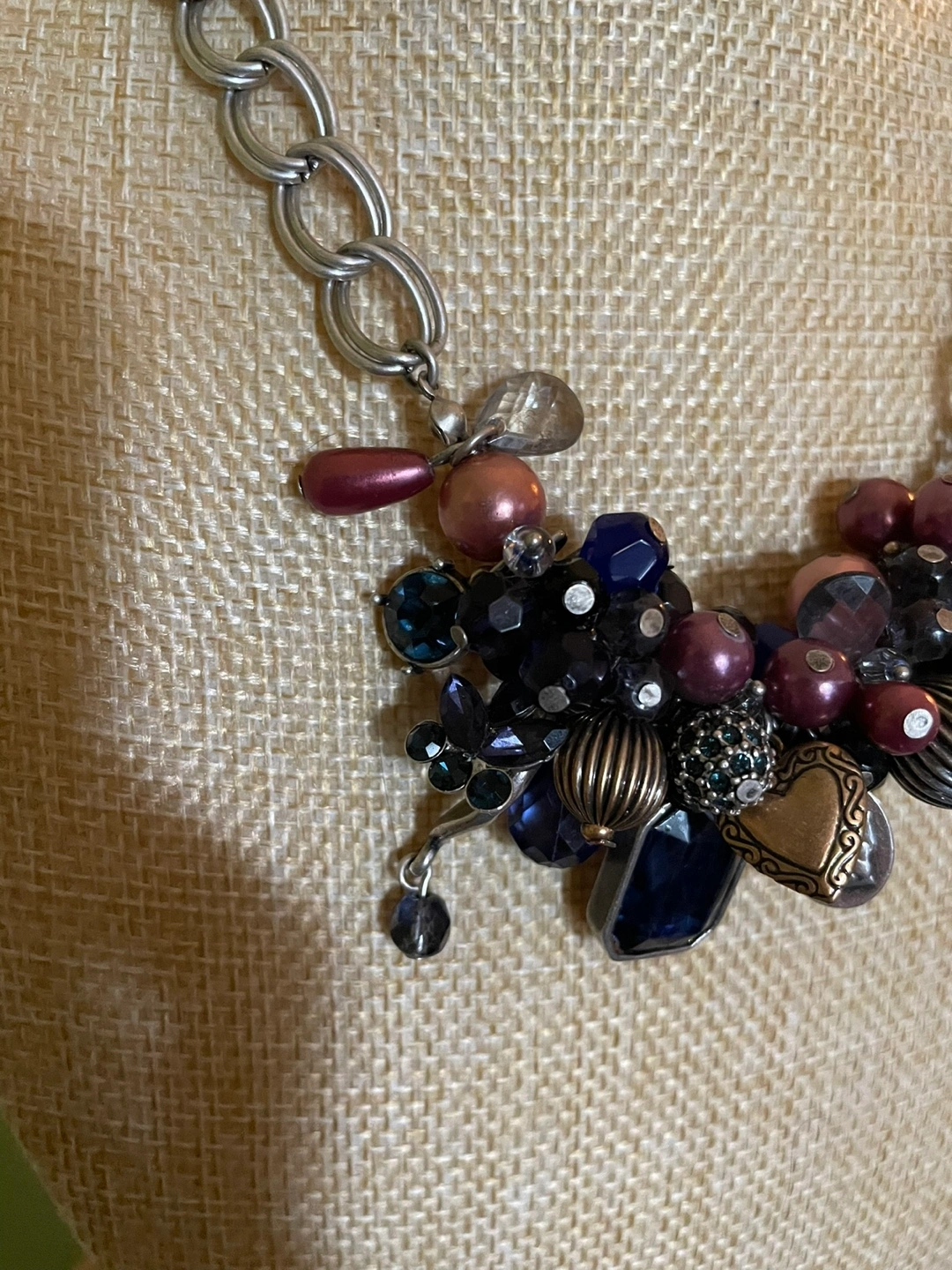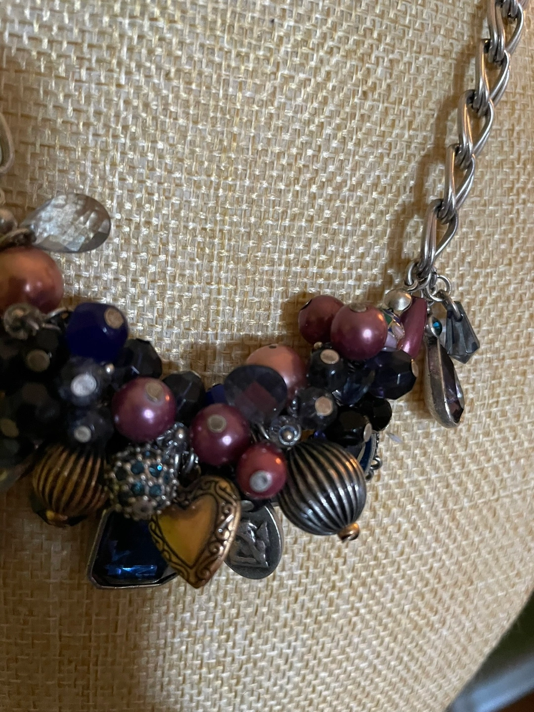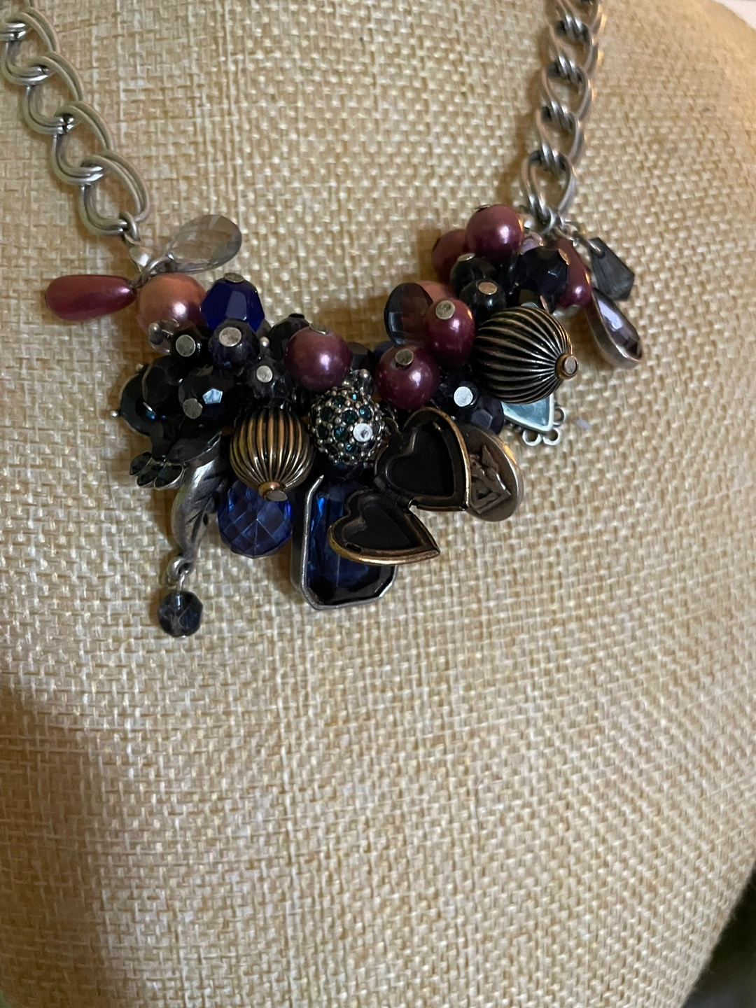 Beautiful statement necklace. Features a chunky silver chain and a cluster of various beads and charms in shades of purple, blue, and black. Includes metallic accents and a heart-shaped charm. Unique and eye-catching.