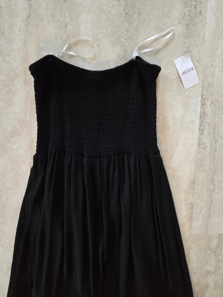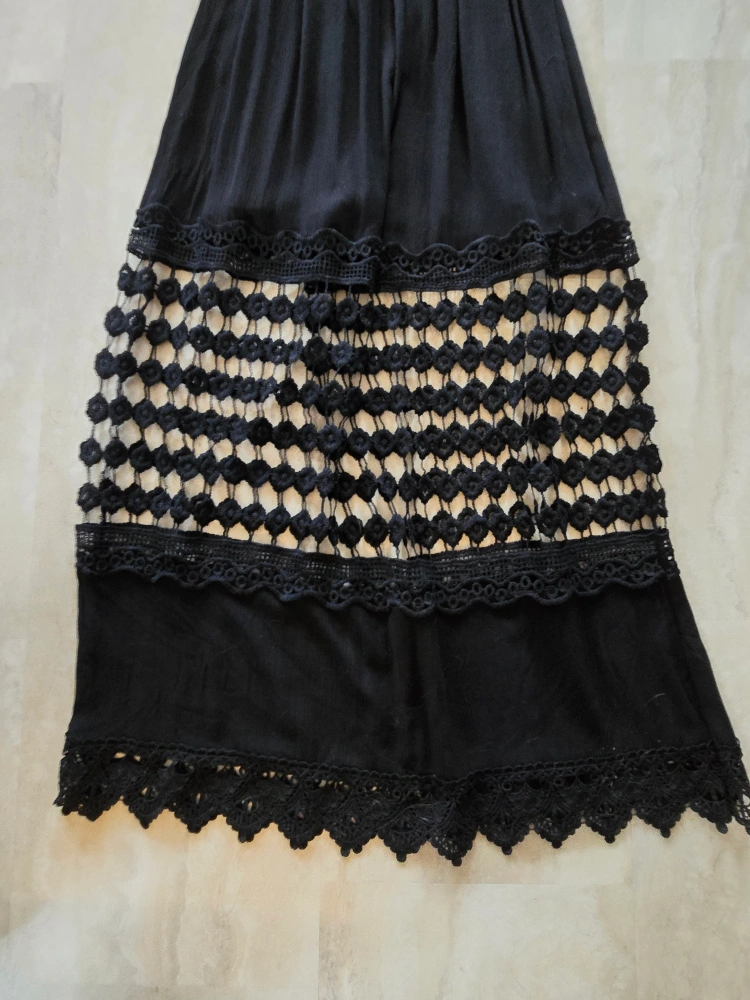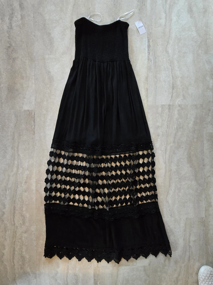 Beautiful black maxi dress. Strapless bodice with smocked detail. Features a stunning crochet lace overlay at the hem. New with tags.