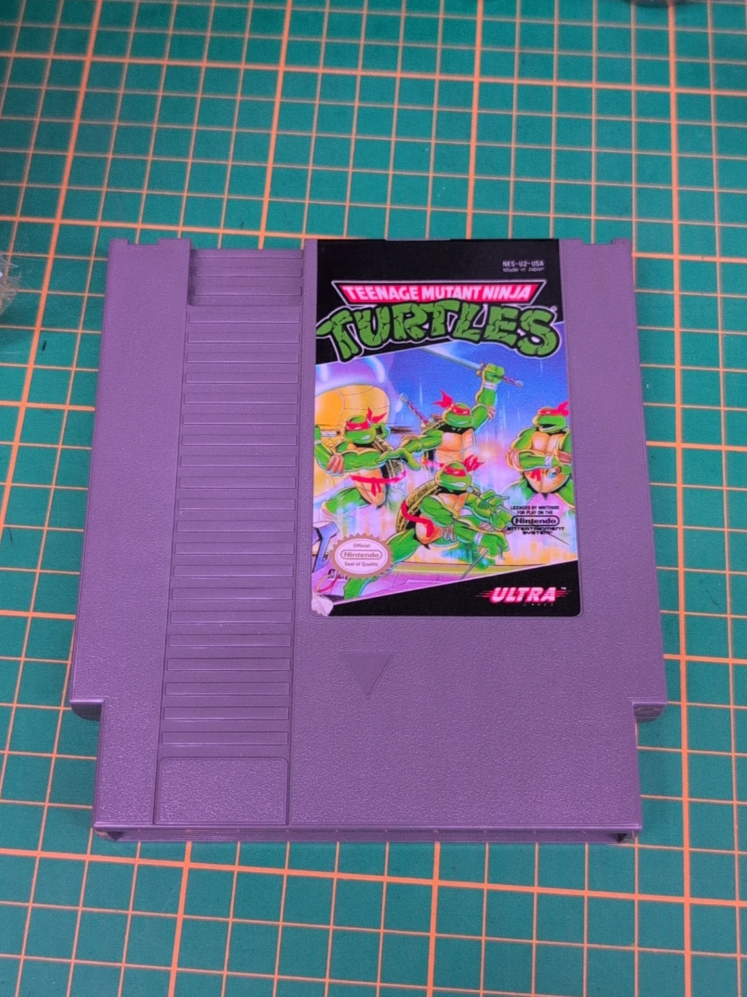 Classic Teenage Mutant Ninja Turtles video game for the NES. It's the USA version, licensed by Nintendo. This game cartridge is purple and features the iconic turtles on the label. A must-have for retro gamers!