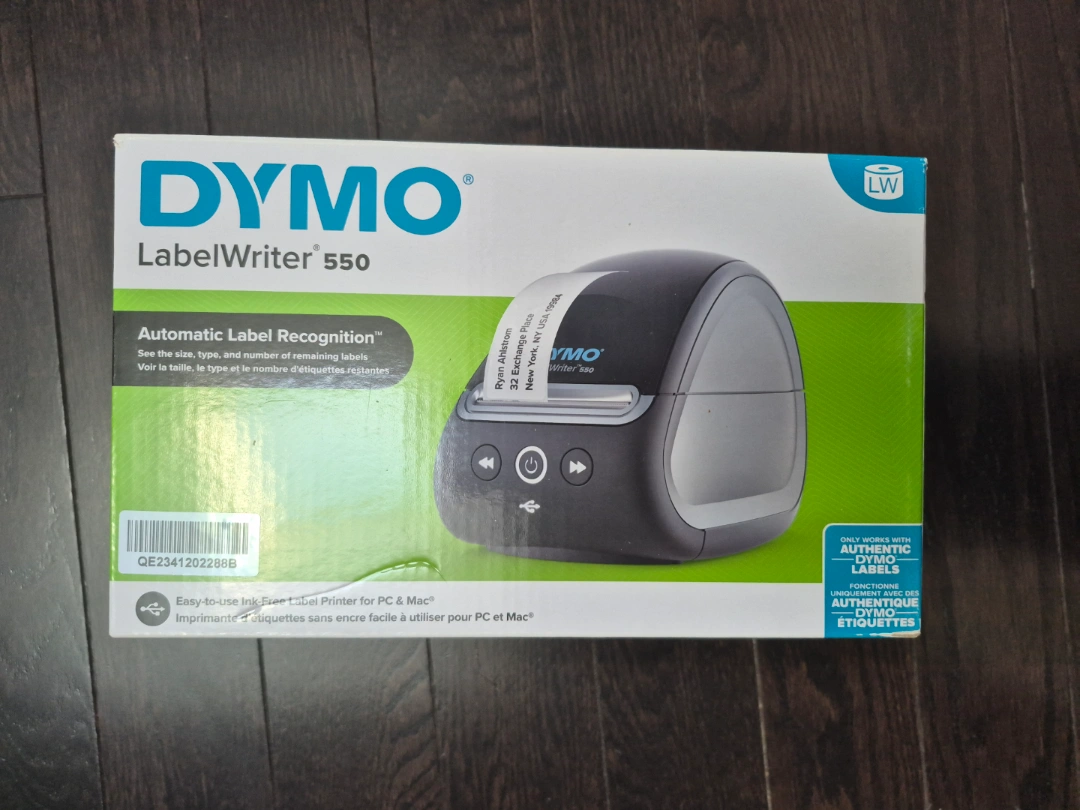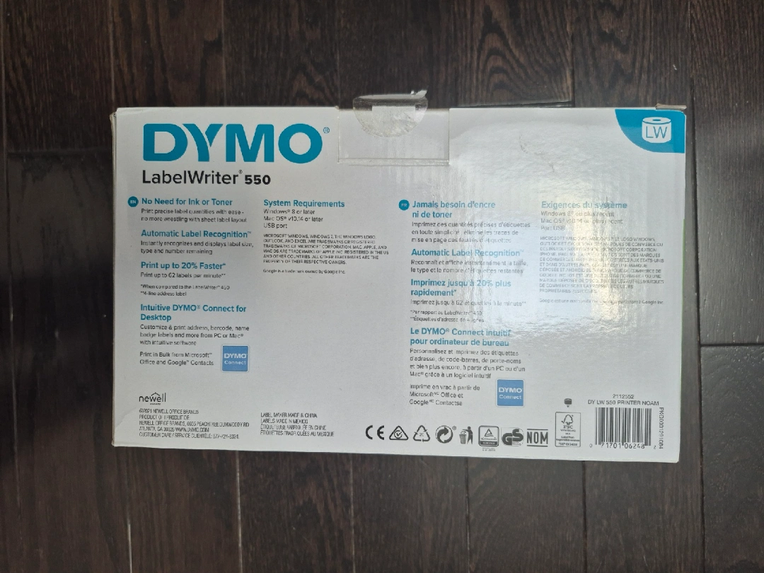 60Selling a brand new DYMO LabelWriter 550, still in its original box! It's an easy-to-use label printer for both PC and Mac. No need for ink or toner!