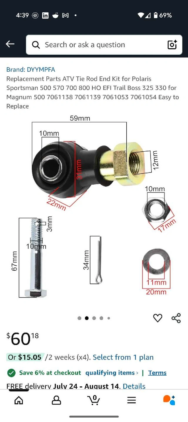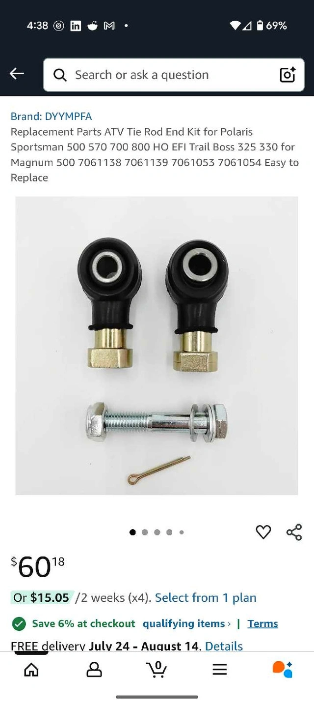 60I'm selling a DYMPFA ATV Tie Rod End Kit for Polaris Sportsman. This replacement part is compatible with several Polaris models including 500, 570, 700, 800 HO EFI, Trail Boss 325, 330, and Magnum 500. It includes part numbers 7061138, 7061139, 7061053, and 7061054, making it easy to replace your old or damaged tie rod end. This tie rod end kit is in new condition. For Sale By: Owner