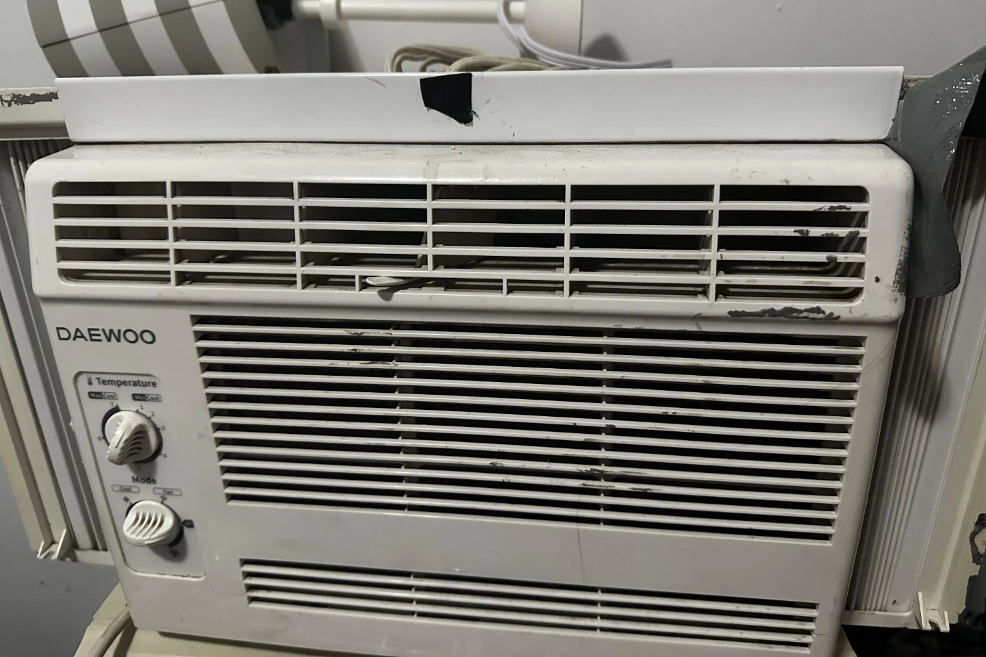 Daewoo window unit air conditioner. Model DWC-F05B9KCC-Y. Cooling capacity 5000 Btu/h. Manufactured 02/2020. Includes original mounting hardware.