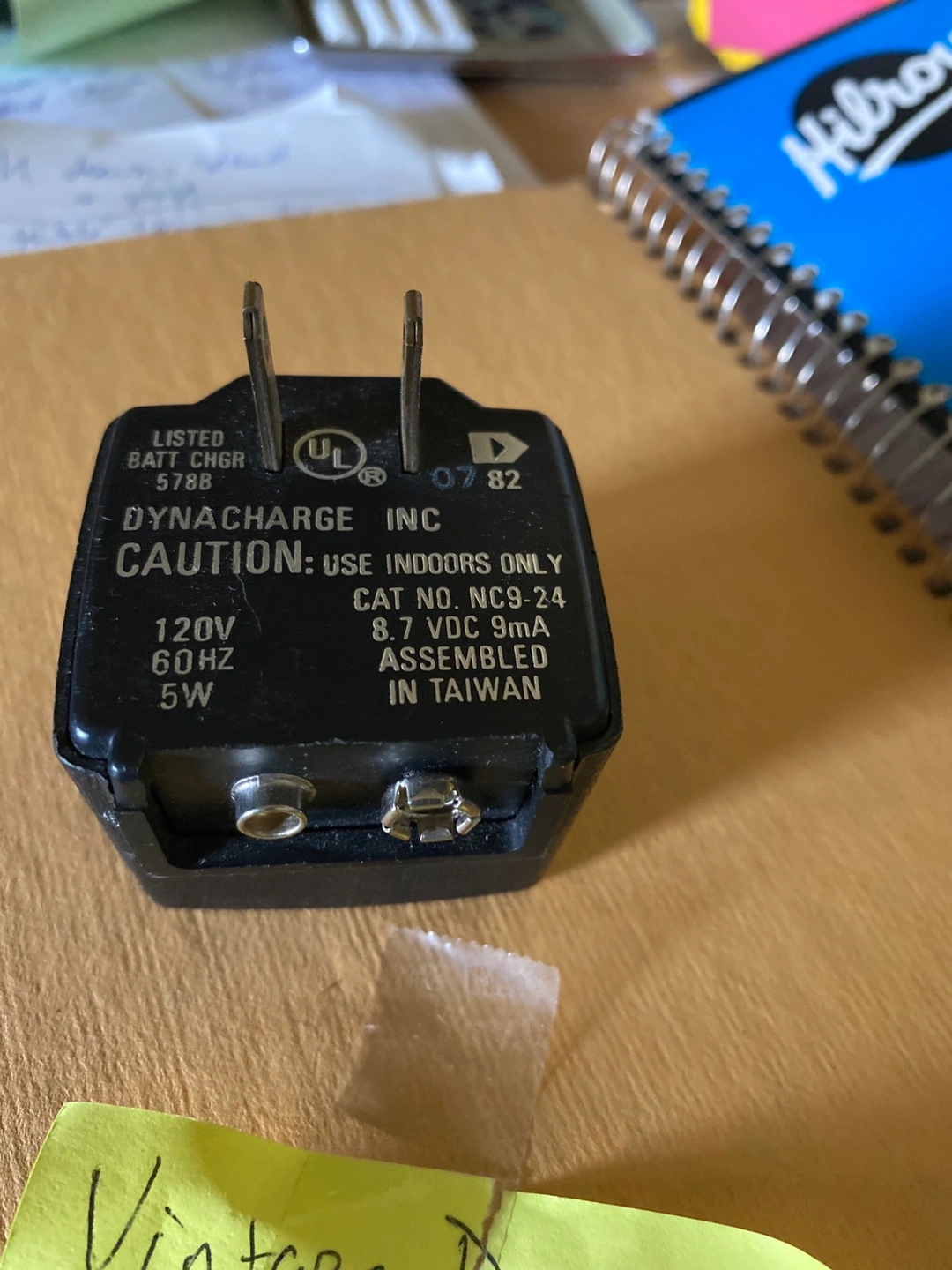 Selling a Dynacharge Inc 9V battery charger. It's marked with 'CAT NO. NC9-24' and '8.7 VDC 9mA'. It's designed for indoor use only and assembled in Taiwan (price compare 8.99) Moving Sale Pick up only
