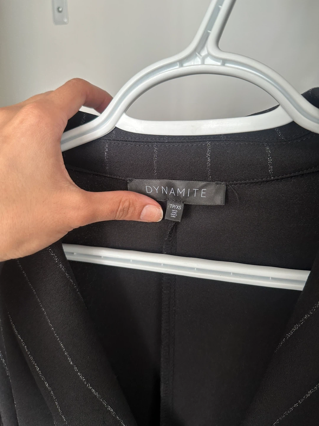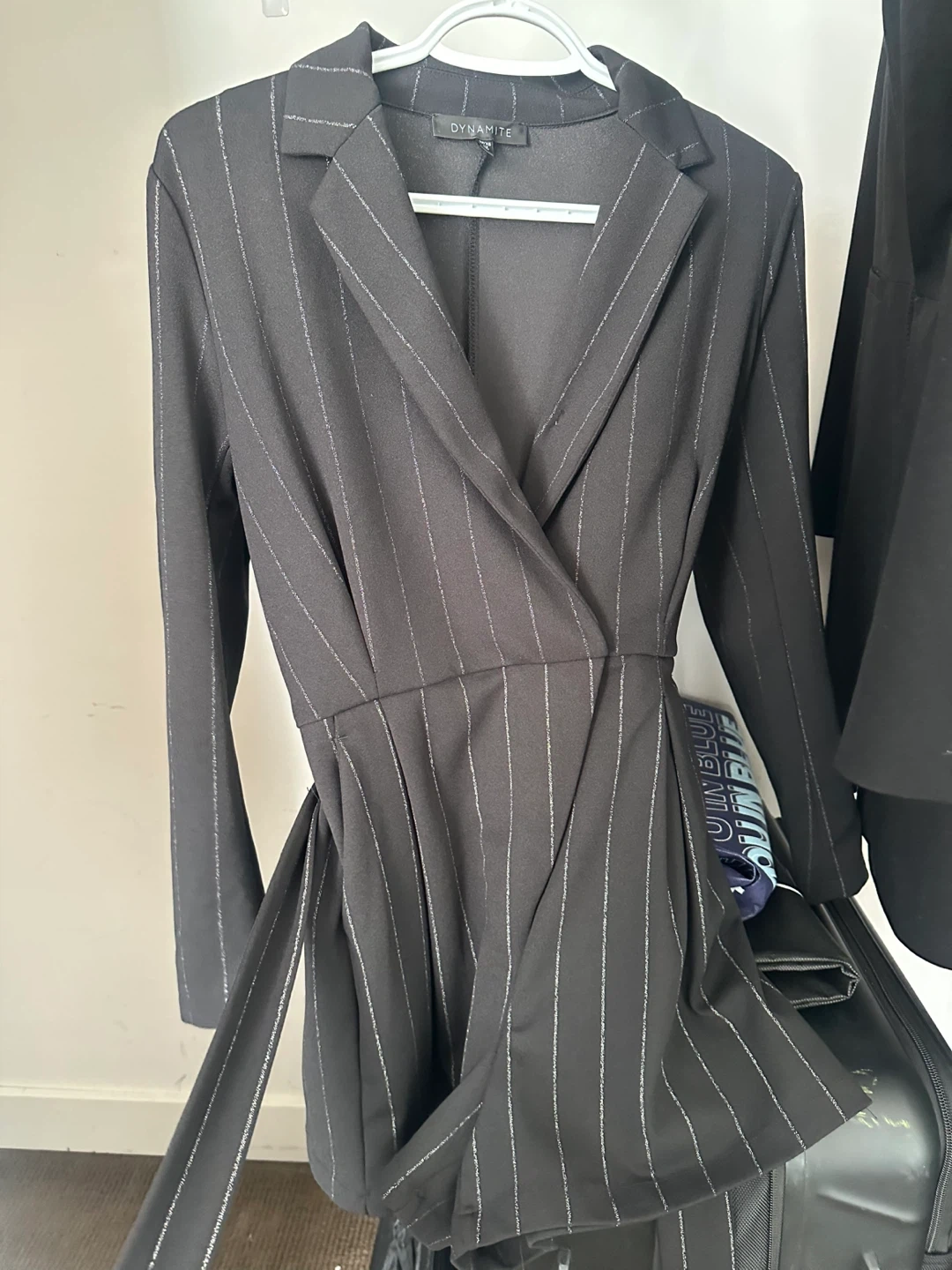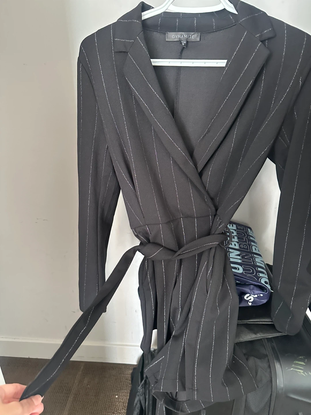 90Selling a stylish Dynamite wrap dress! It's a sleek black with a subtle pinstripe pattern. The dress features a flattering wrap design and a tie at the waist. It's in excellent condition and a size XS. Perfect for a night out or a professional look! Washed and ready for new house.