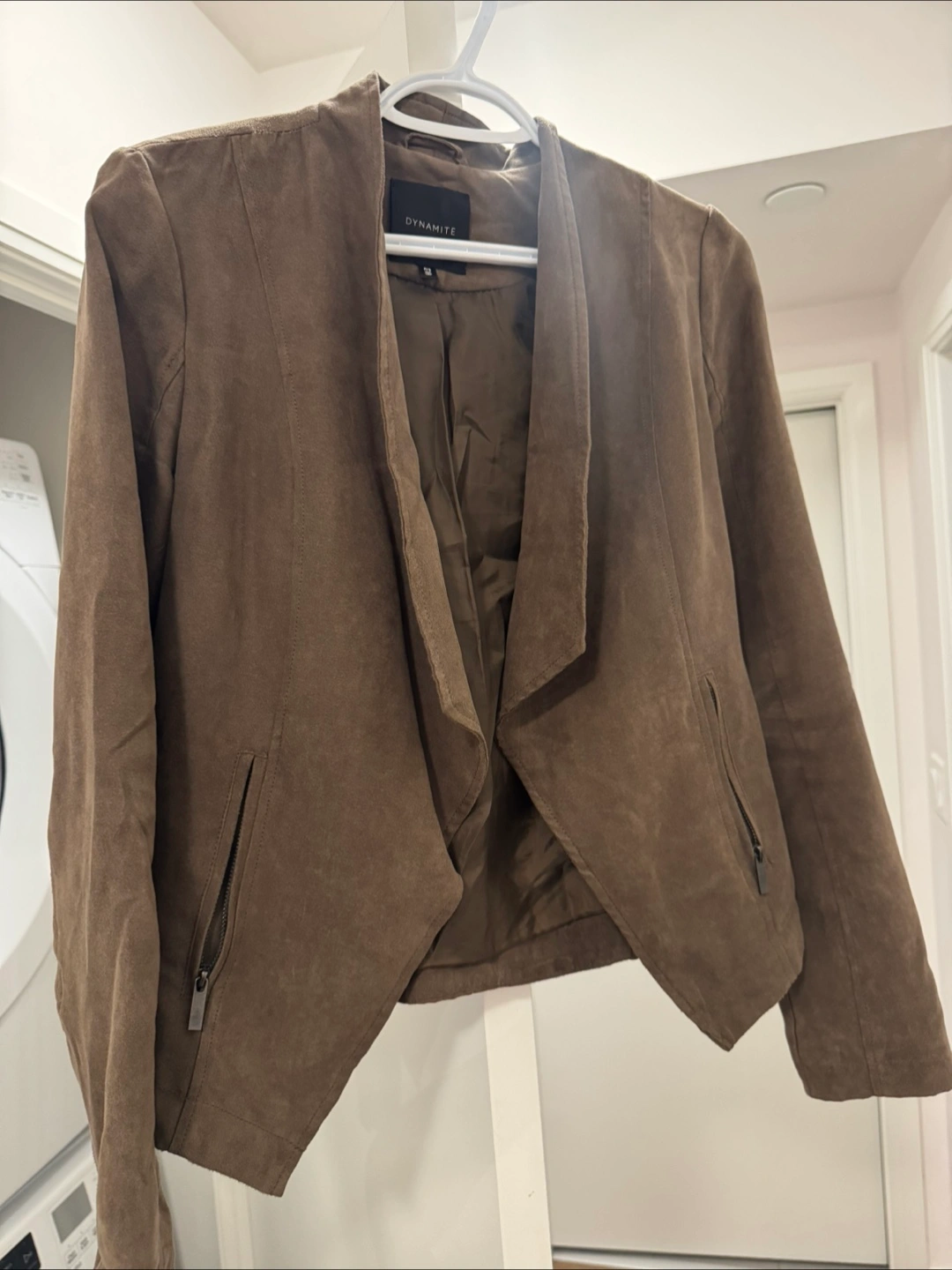 60Selling a Dynamite brown suede jacket in size small. It's in great condition and perfect for layering! The material is soft and comfortable, making it a stylish addition to any wardrobe