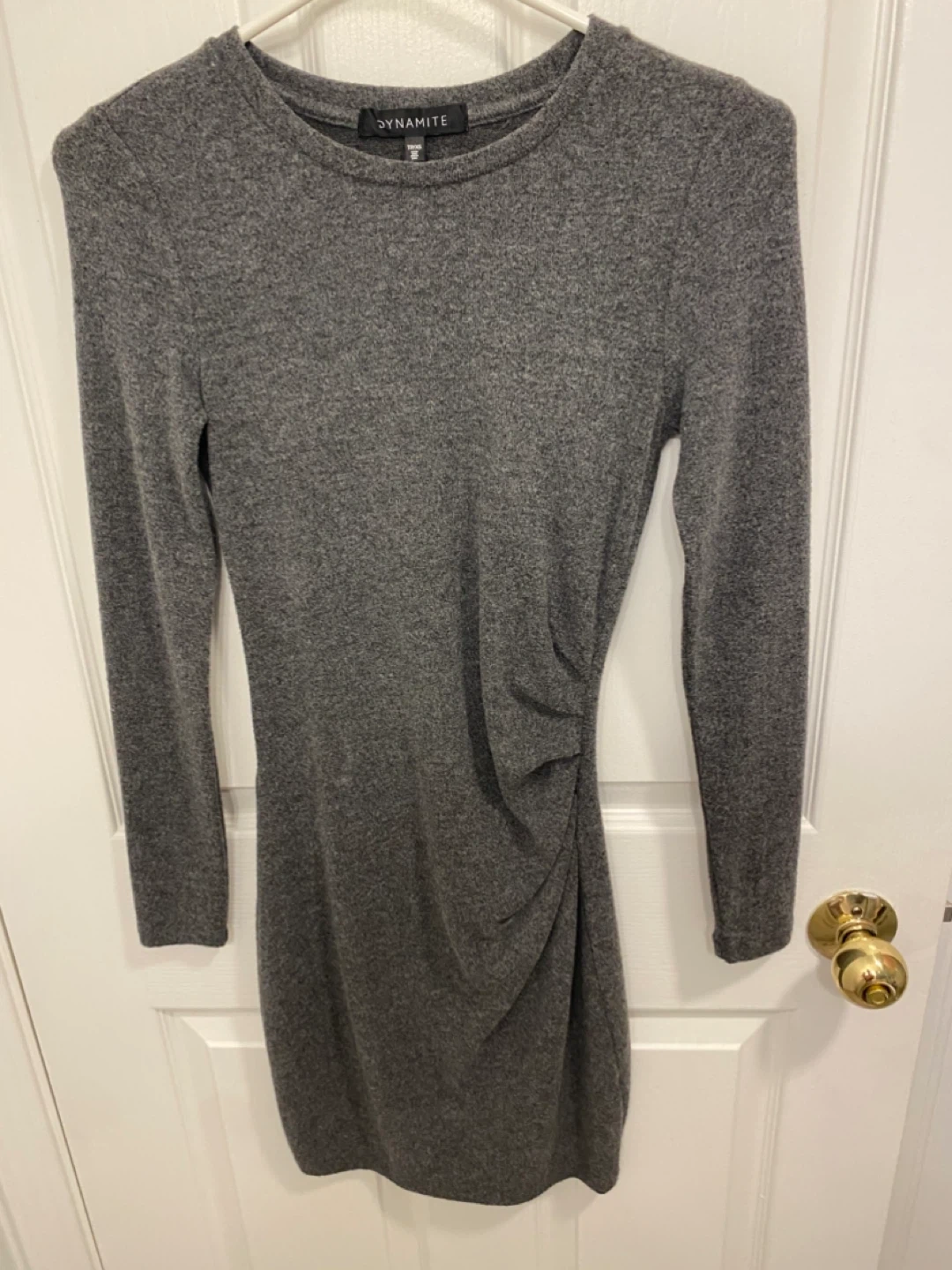 15Cozy grey dresses from Dynamite in a size x-small! It's in great condition and ready for a new home. Perfect for a casual outing or a night out with friends. The material is soft and comfortable, making it a great addition to your wardrobe!