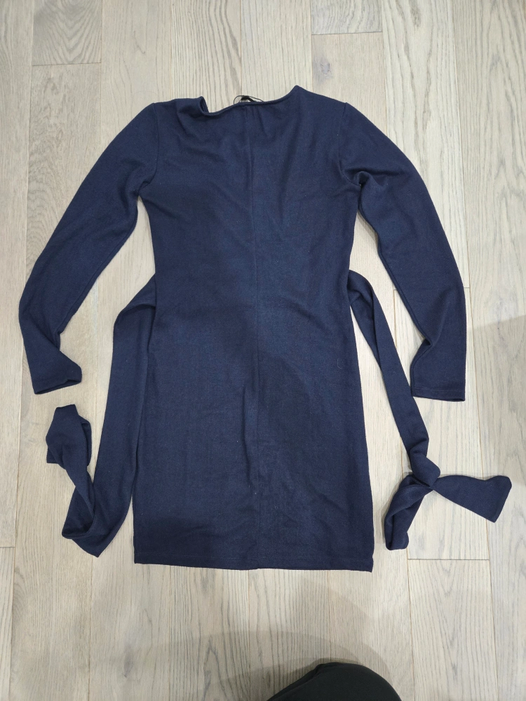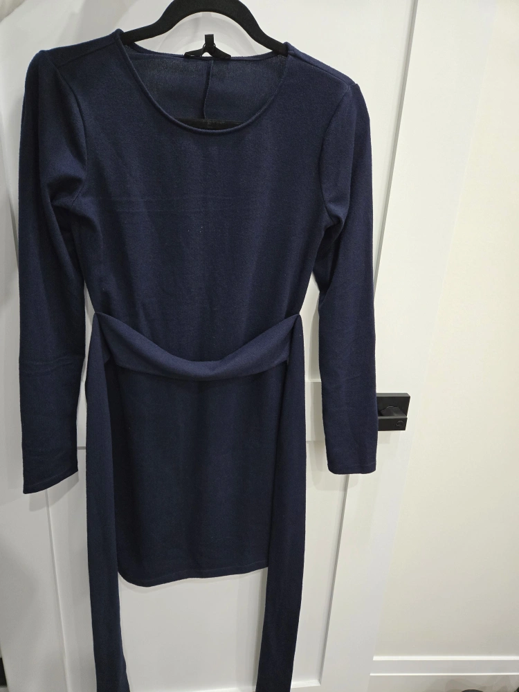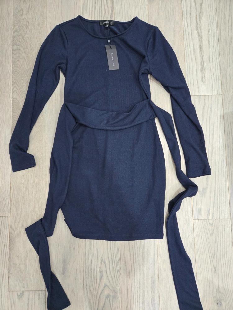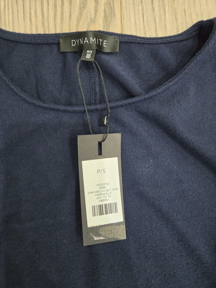This is a Dynamite wrap-around belt dress in Mariana Blue, size P/S. It's in excellent condition and ready for a new home! It features a stylish wrap design and a comfortable fit
