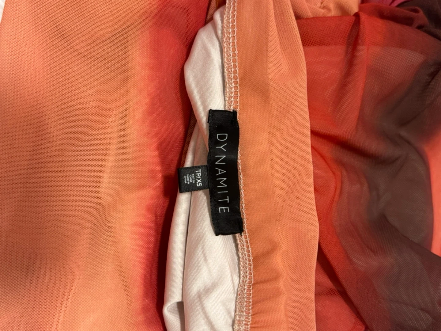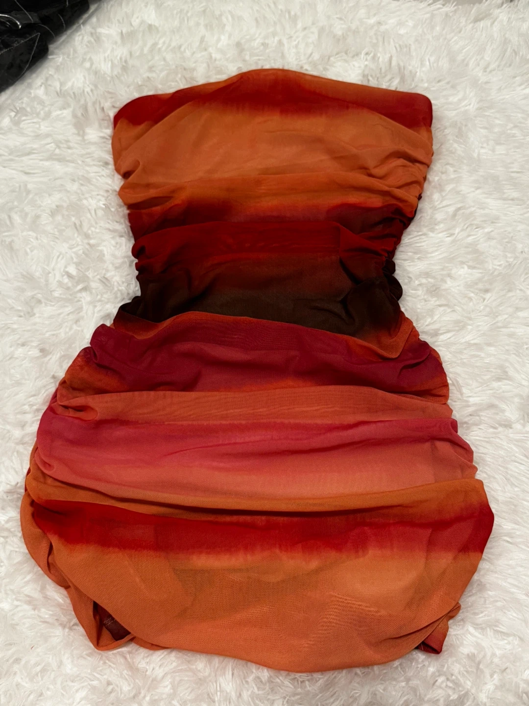 60This Dynamite mini dress features a beautiful ombre pattern in shades of red, orange, and brown. It's a size XS and in great condition. Like new, used once. Perfect for a night out, special occasion or beach!