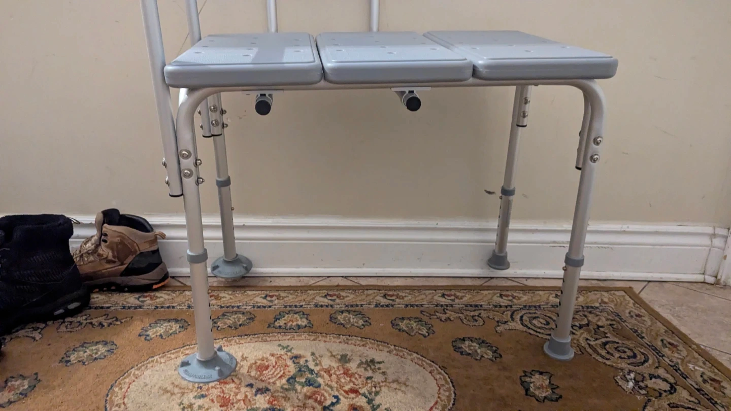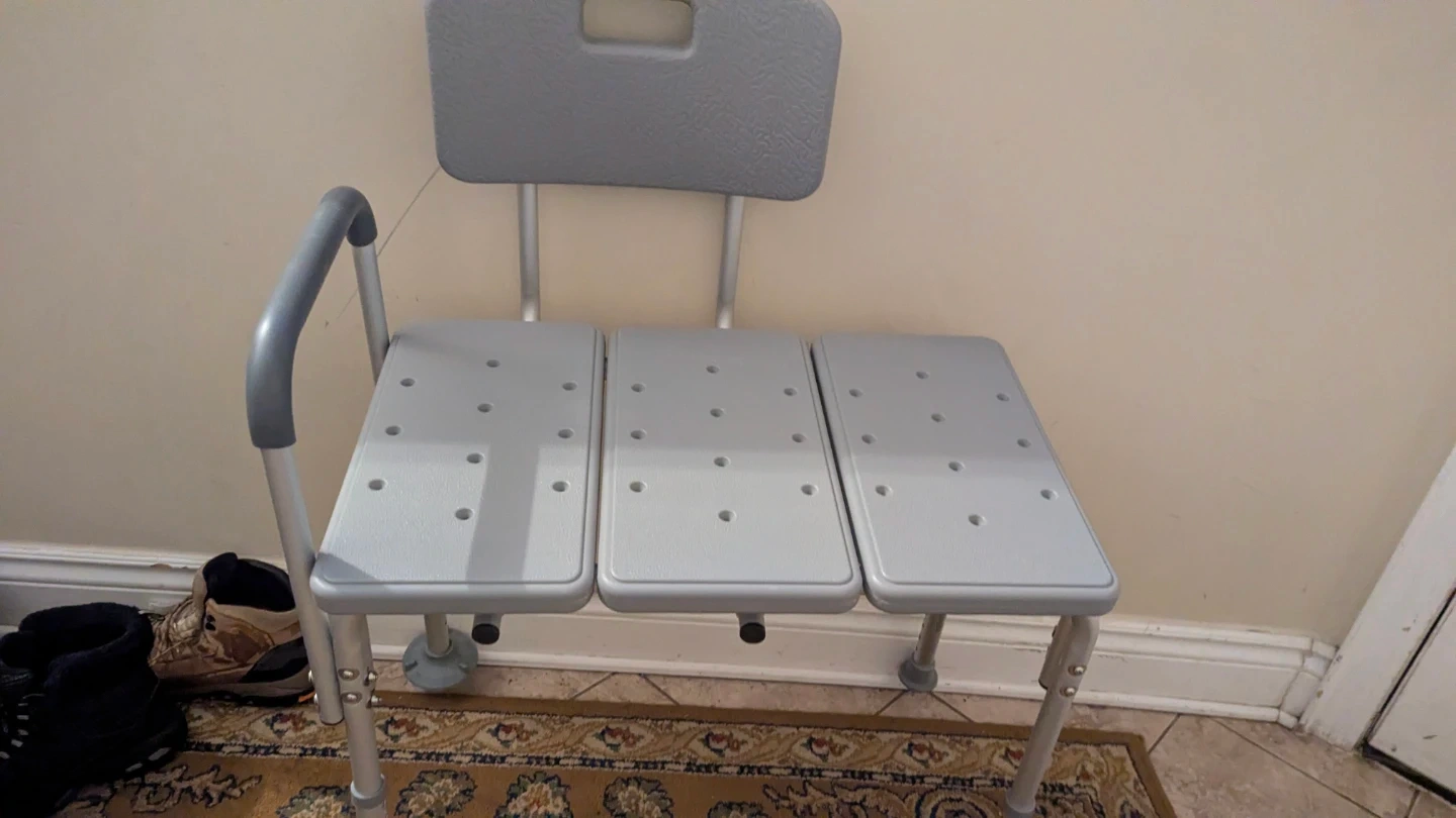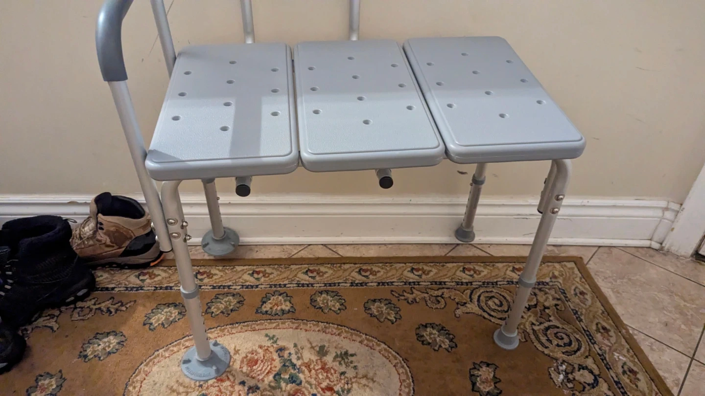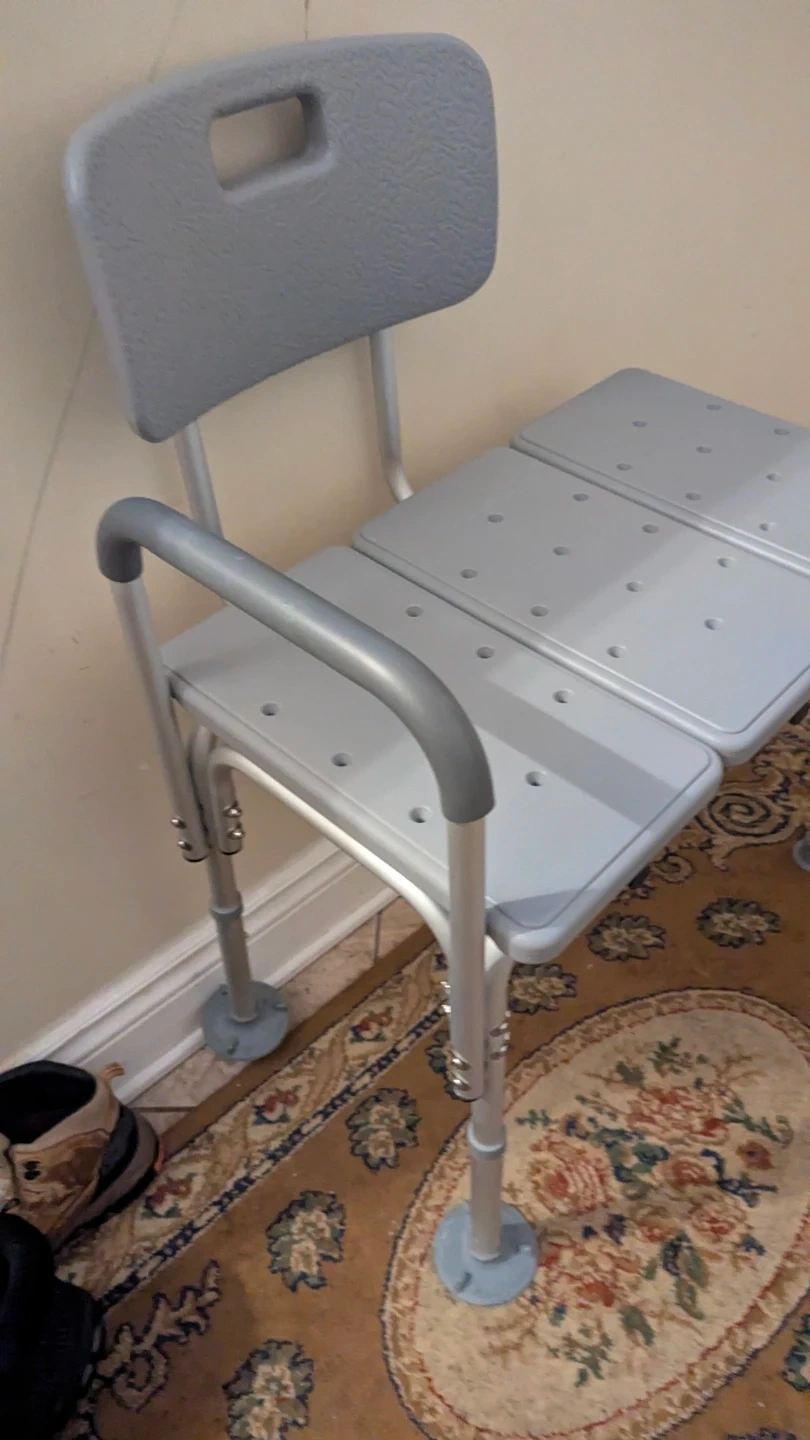 Selling a bath/shower chair. It features a backrest and adjustable legs for a comfortable and safe shower experience. Great for anyone needing a little extra support!