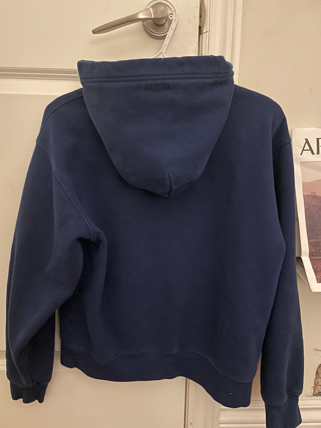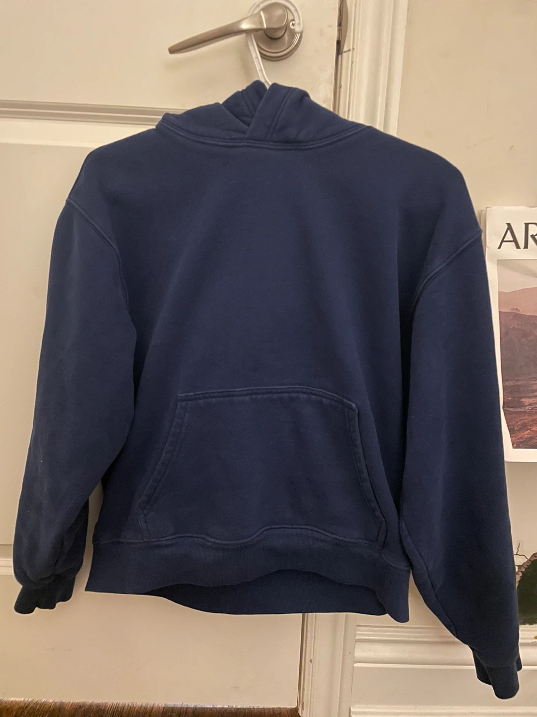 Aritzia navy blue hoodie made from sweatfleece material. It's a size medium and offers a perfect fit. This pullover style is great for casual wear.