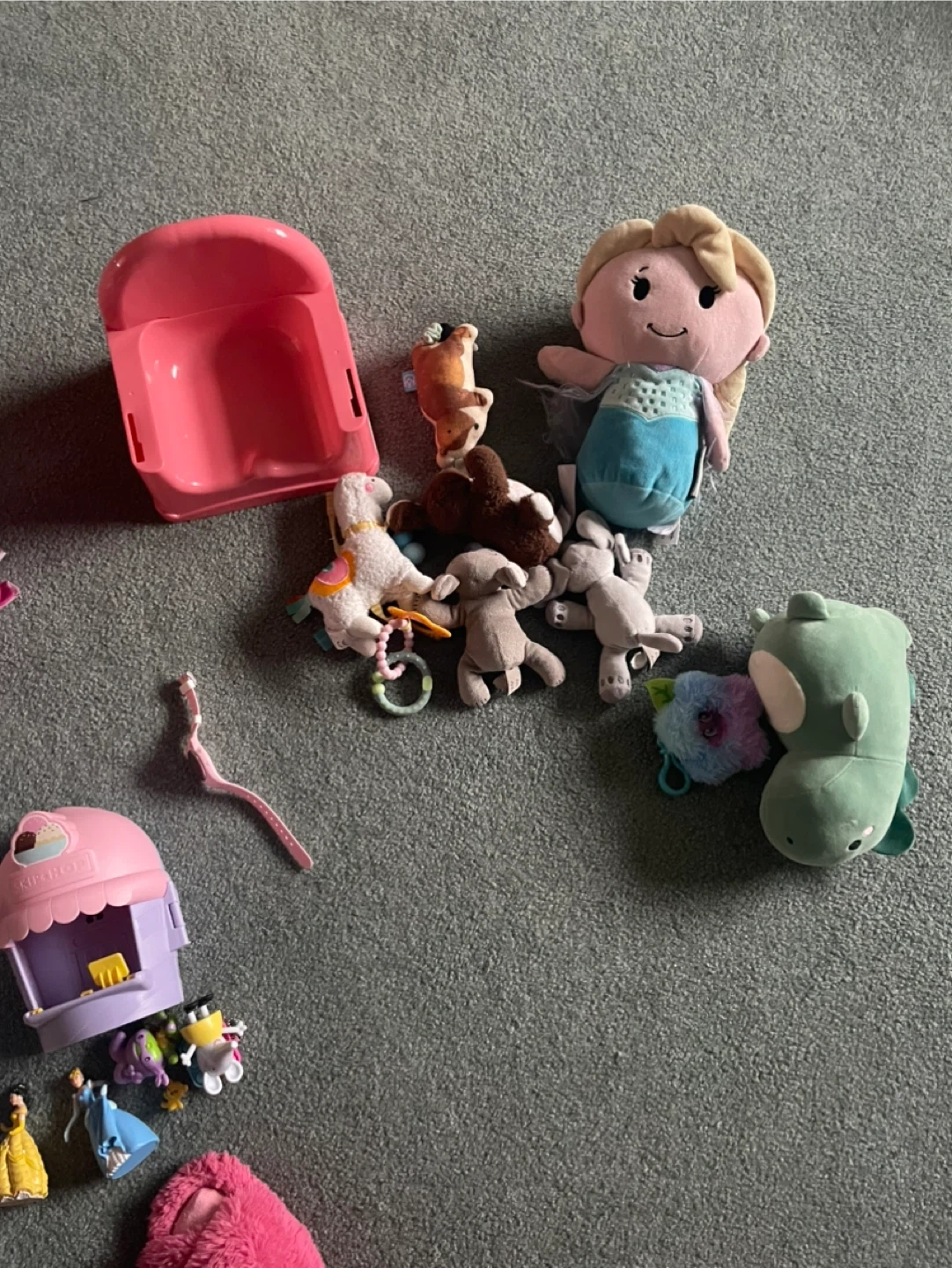 A collection of assorted toddler toys including plush animals, building blocks, and figures. These toys are great for imaginative play and development.