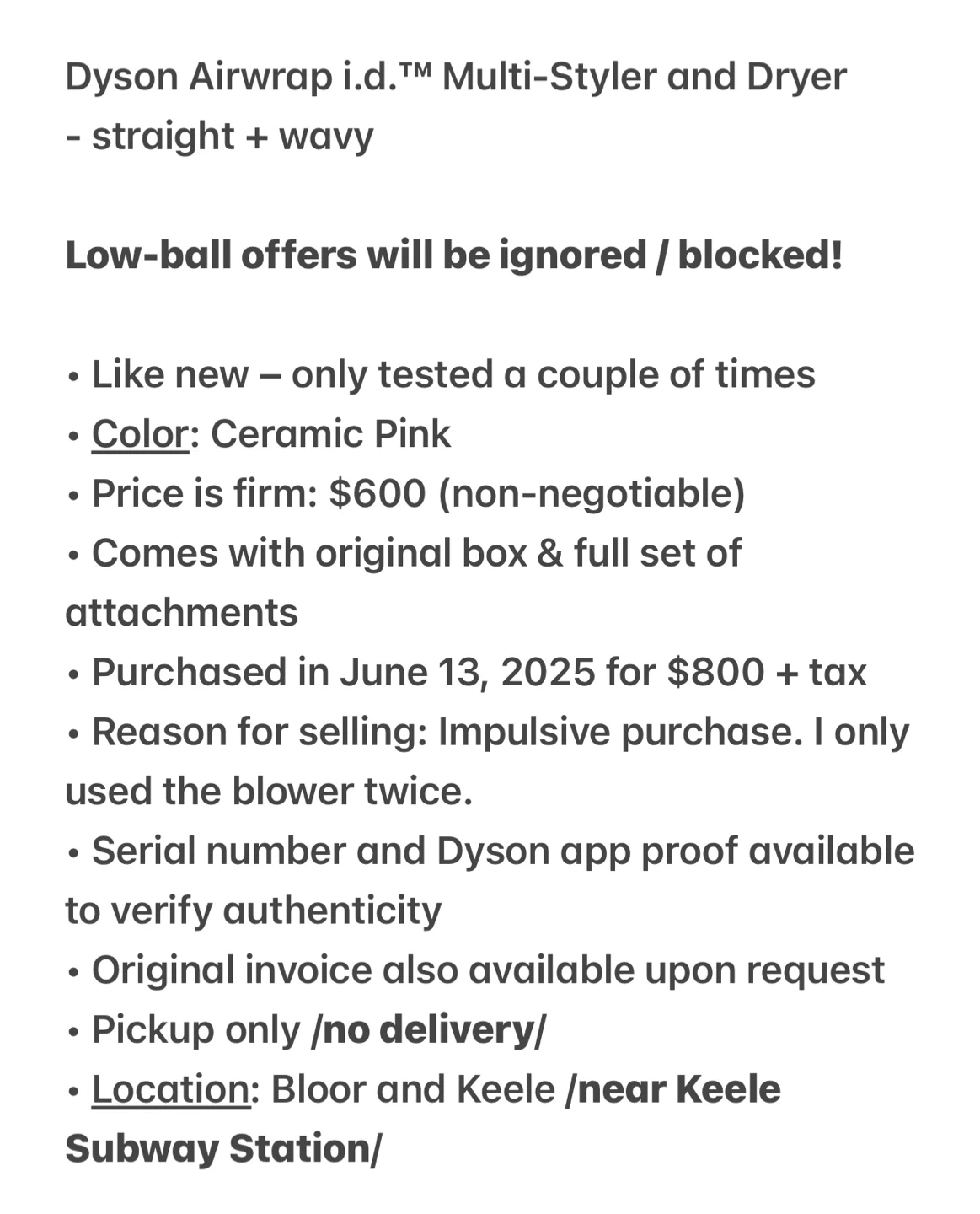 Dyson Airwrap i.d.™ Multi-Styler and Dryer - straight + wavy Low-ball offers will be ignored / blocked! • Like new – only tested a couple of times • Color: Ceramic Pink • Price is firm: $600 (non-negotiable) • Comes with original box & full set of attachments • Purchased in June 13, 2025 for $800 + tax • Reason for selling: Impulsive purchase. I only used the blower twice. • Serial number and Dyson app proof available to verify authenticity • Original invoice also available upon request • Pickup only /no delivery/ • Location: Bloor and Keele /near Keele Subway Station/