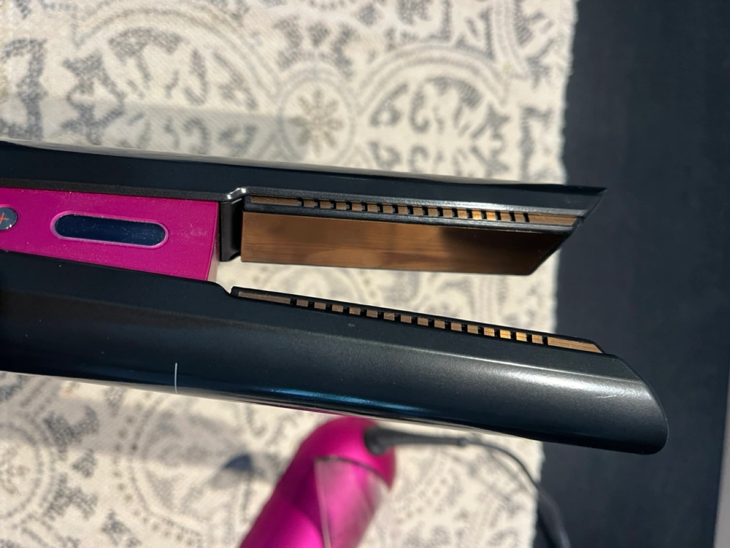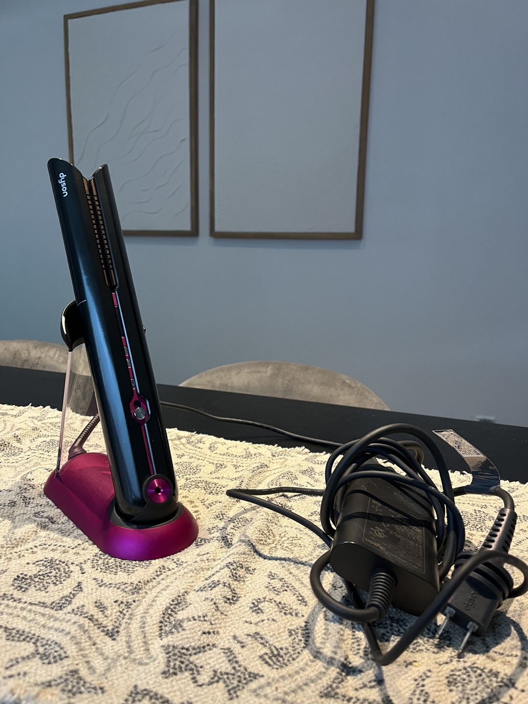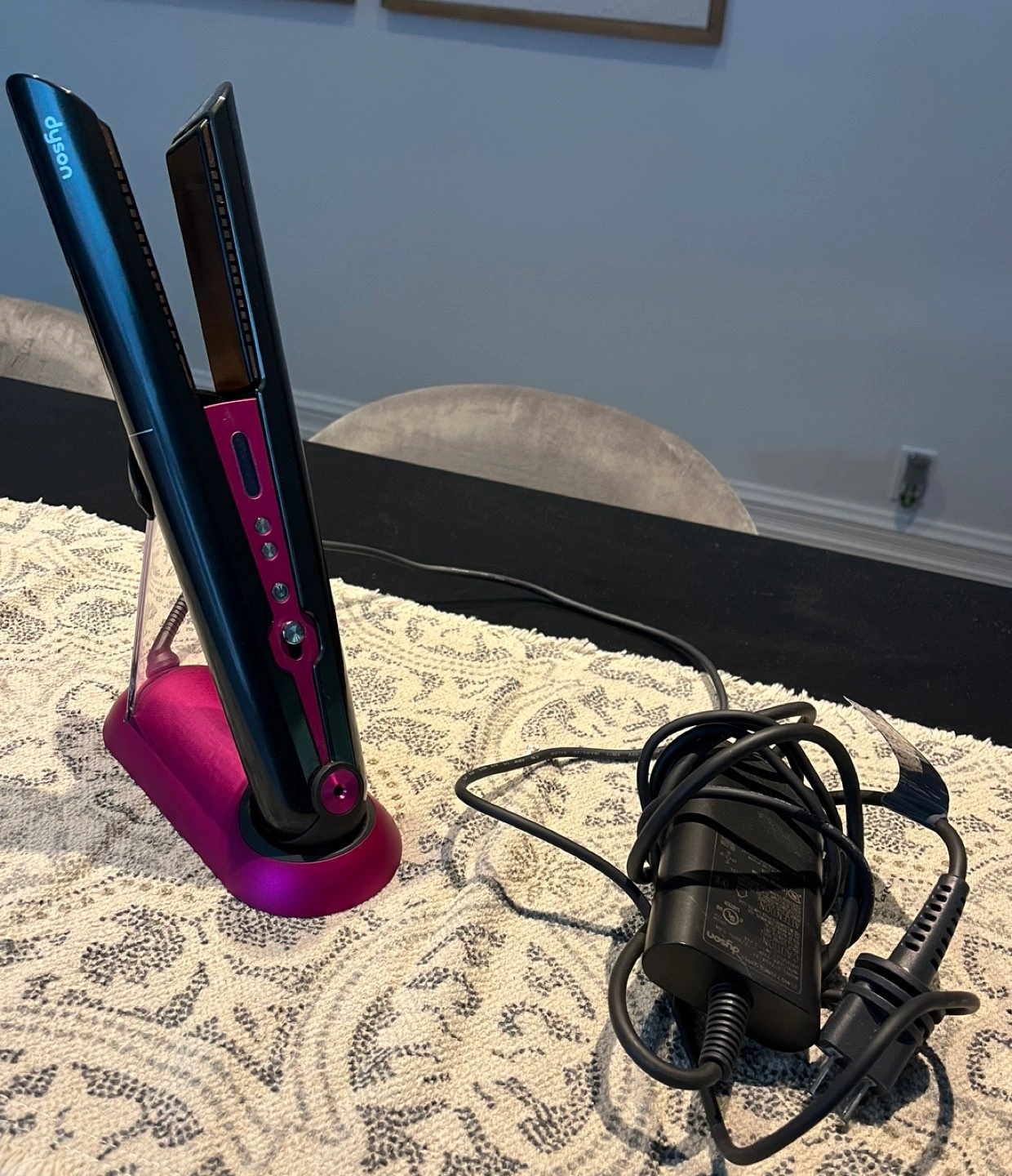 Only used once, it’s a bit too good for my fine hair! The Dyson Corrale™ straightener is the only straightener with flexing plates that shape around your hair, gathering it neatly together on each pass. This extra control means you can achieve the same style but with less heat — and therefore half the damage. It also means enhanced styling, for reduced frizz and fewer flyaways. The Dyson Corrale™ straightener is engineered to create a variety of different styles — from curls and waves, to smooth and sleek. INCLUDED: Dyson Corrale™ straightener Charging dock Magnetic 360˚ charging cable WHAT IT DOES Intelligent Heat Control Intelligent heat control responds to the thickness, texture, and length of your hair and automatically controls the temperature for optimal styling results. Creates a range of styles The curved outer body is engineered to support curl structure, helping you create curls and waves — as well as sleek, straight styles. Suitable for all hair types Three precise heat settings (165°C, 185°C and 210°C) to suit your hair type, length, and desired style. Up to 30 minutes cordless styling. Delivers the thermal performance of a corded straightener. Recharges to 90% in just 40 minutes. Fully recharges in just 70 minutes. Docking station included to rest and recharge straightener as you style cord-free. Style corded, for longer run time To maximize styling time, start with your straightener fully charged and style with the cord. Auto shut-off and Safety lock Switches off after 10 minutes of inactivity for added peace of mind. Safety lock for immediate storage after use. HOW TO USE IT Engineered to create a range of styles • Create textured waves for a tousled look. • Create voluminous, bouncy curls that move freely. • Create texture and natural looking waves, with a sweeping full fringe. • Create smooth, flowing waves for a more glamourous look. • Create smooth hair with gentle bends and movement at the ends. SPECIFICATIONS 3 heat settings 4-cell lithium-ion battery Power: 200 W Universal voltage: 10.8V-16.8V Cable Length: 3.31 m Weight: 0.561 kg Product dimensions: 45 mm H x 292 mm L x 41 mm W