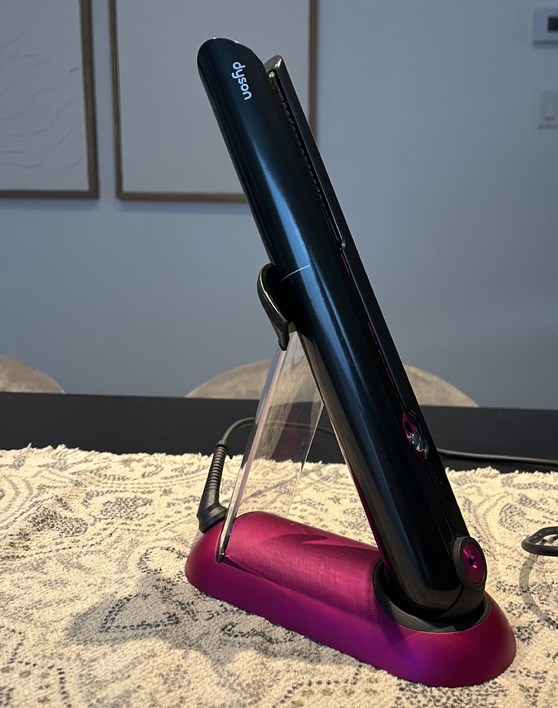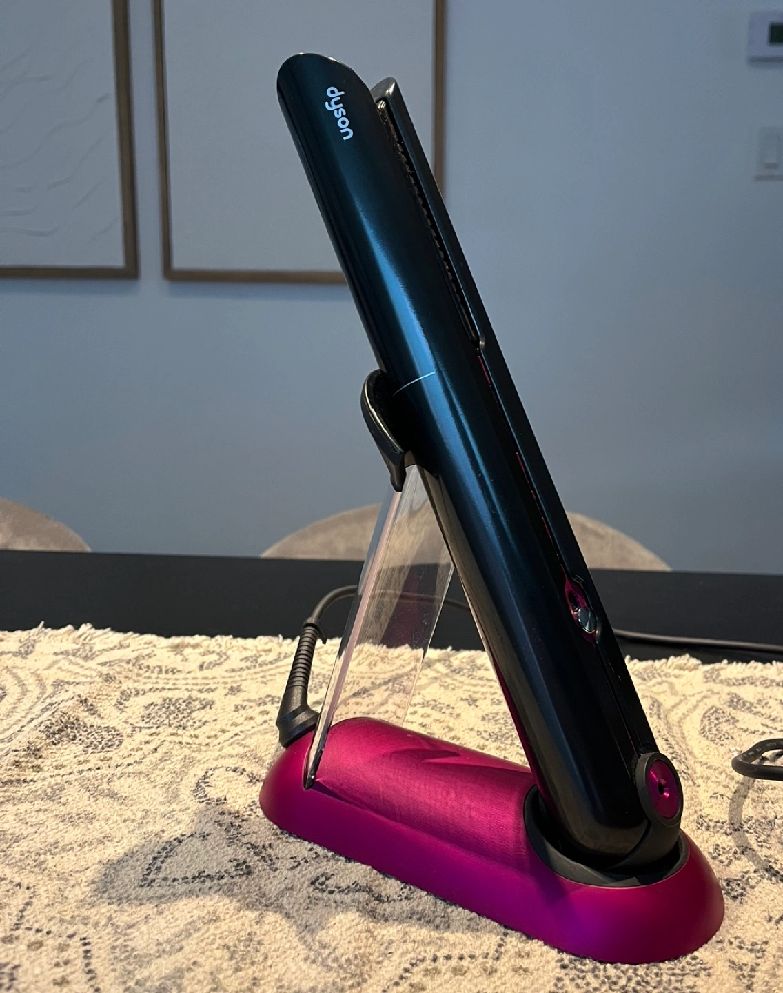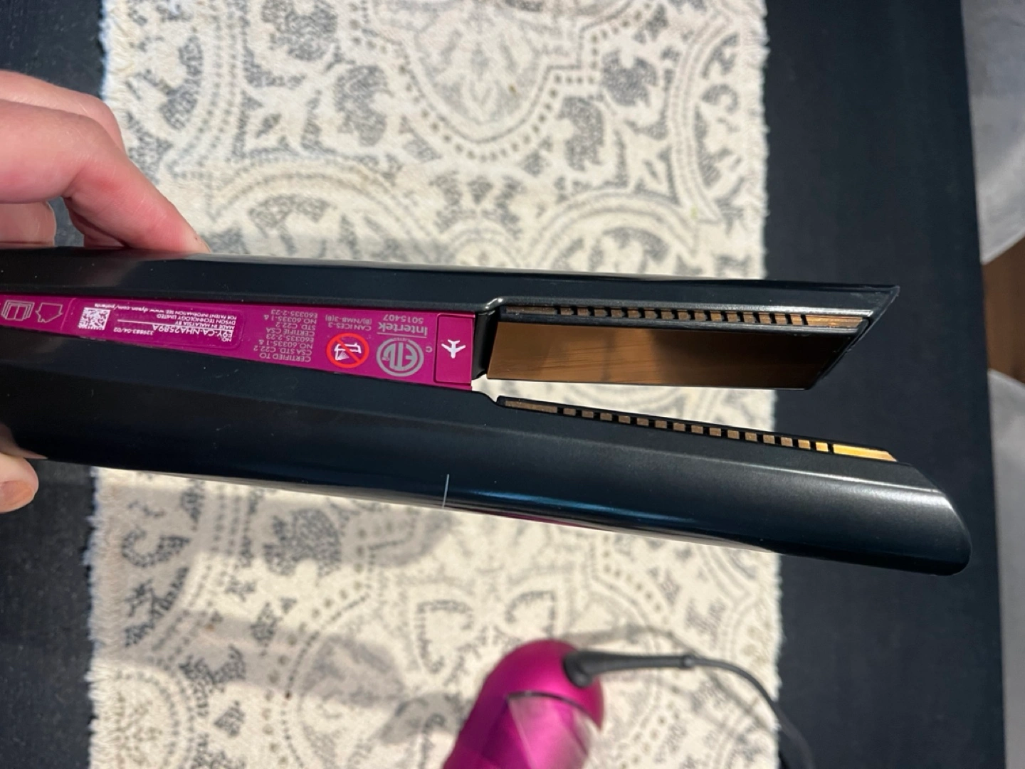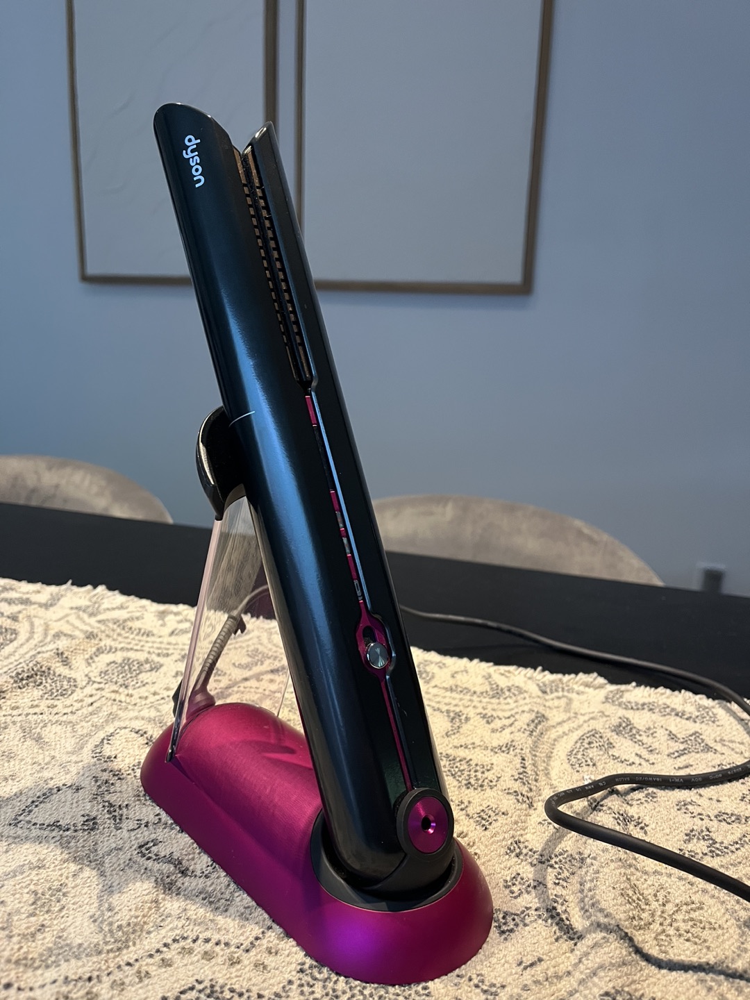 Only used once, it’s a bit too good for my fine hair! The Dyson Corrale™ straightener is the only straightener with flexing plates that shape around your hair, gathering it neatly together on each pass. This extra control means you can achieve the same style but with less heat — and therefore half the damage. It also means enhanced styling, for reduced frizz and fewer flyaways. The Dyson Corrale™ straightener is engineered to create a variety of different styles — from curls and waves, to smooth and sleek. INCLUDED: Dyson Corrale™ straightener Charging dock Magnetic 360˚ charging cable WHAT IT DOES Intelligent Heat Control Intelligent heat control responds to the thickness, texture, and length of your hair and automatically controls the temperature for optimal styling results. Creates a range of styles The curved outer body is engineered to support curl structure, helping you create curls and waves — as well as sleek, straight styles. Suitable for all hair types Three precise heat settings (165°C, 185°C and 210°C) to suit your hair type, length, and desired style. Up to 30 minutes cordless styling. Delivers the thermal performance of a corded straightener. Recharges to 90% in just 40 minutes. Fully recharges in just 70 minutes. Docking station included to rest and recharge straightener as you style cord-free. Style corded, for longer run time To maximize styling time, start with your straightener fully charged and style with the cord. Auto shut-off and Safety lock Switches off after 10 minutes of inactivity for added peace of mind. Safety lock for immediate storage after use. HOW TO USE IT Engineered to create a range of styles • Create textured waves for a tousled look. • Create voluminous, bouncy curls that move freely. • Create texture and natural looking waves, with a sweeping full fringe. • Create smooth, flowing waves for a more glamourous look. • Create smooth hair with gentle bends and movement at the ends. SPECIFICATIONS 3 heat settings 4-cell lithium-ion battery Power: 200 W Universal voltage: 10.8V-16.8V Cable Length: 3.31 m Weight: 0.561 kg Product dimensions: 45 mm H x 292 mm L x 41 mm W