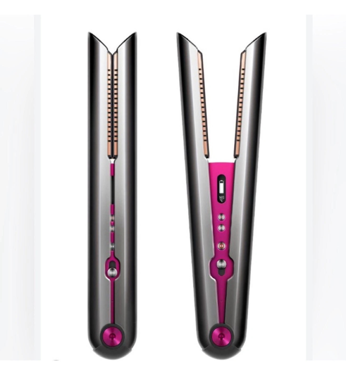 Stylish hair straightener. Features a sleek design with black, silver, and pink accents. Great for creating a perfect sleek look with its innovative design.