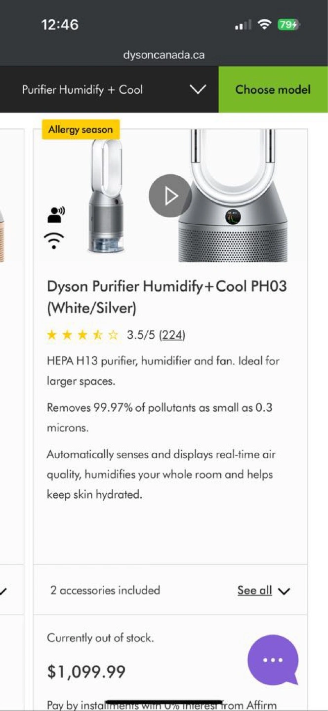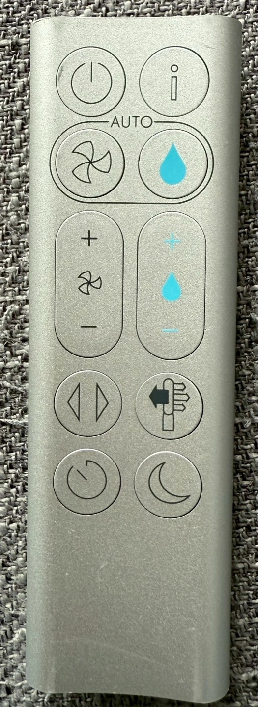 72Dyson air purifier, humidifier, and fan. HEPA H13 filter. Removes 99.97% of pollutants. Auto-senses and displays air quality. Includes remote.