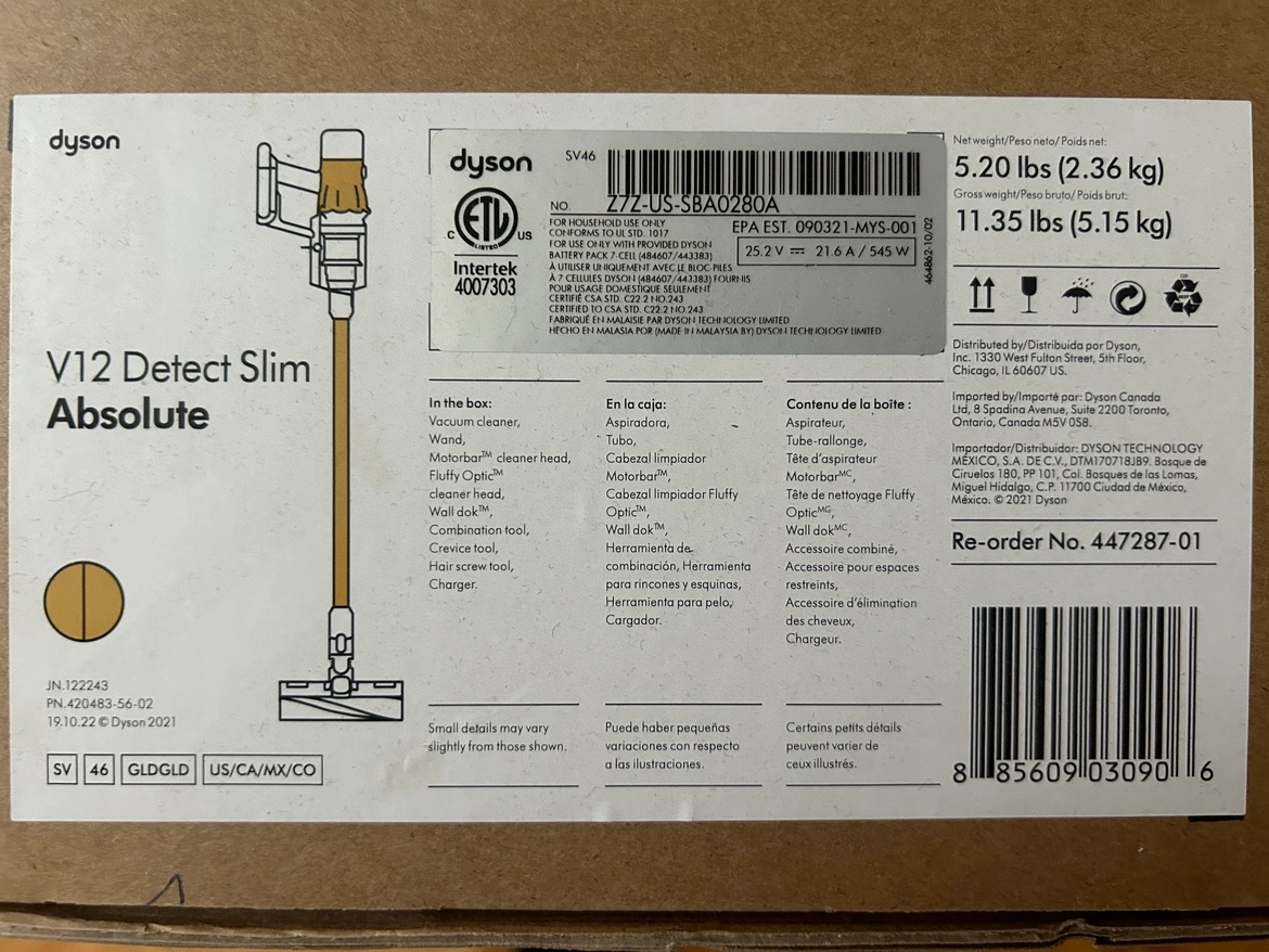 37Dyson V12 Detect Slim Absolute cordless vacuum in gold. Includes all original attachments and box.