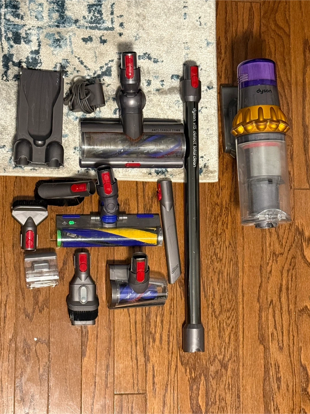 120Selling a Dyson V15 Detect Total Clean cordless vacuum! It's in great shape and ready to help keep your place spotless. Comes with all the attachments you see in the pictures. 7 attachments in total. Includes: - Laser dust detection - intelligent suction - LCD screen - advanced filtration captures 99.9% of particles - hair screw tool for pet hair - removal battery - HEPA filter - 3 power levels Attachments: - hair screw tool - mini soft dusting brush - crevice tool - docking station - Laser slim fluffy cleaner head - digital motorbar cleaner head - combination tool - wand clip - charger Cash and pick-up ONLY Low ball offers will NOT be accepted