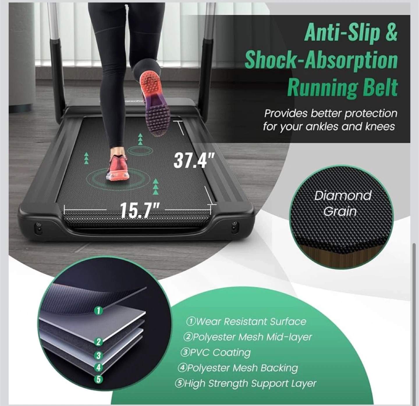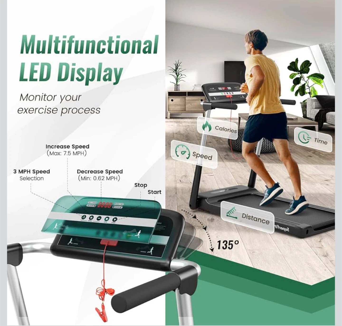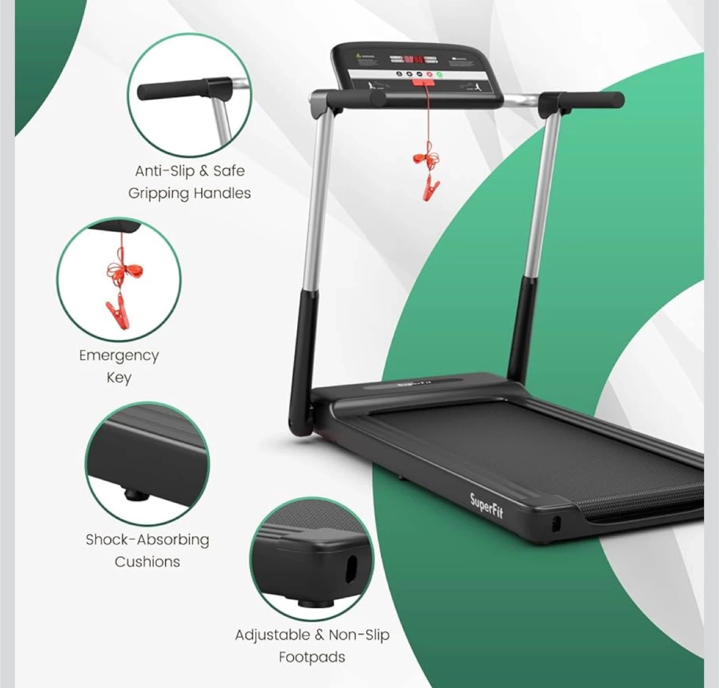 SuperFit foldable treadmill for convenient home workouts. It features an anti-slip, shock-absorption running belt measuring 15.7" wide by 37.4" long. The multifunctional LED display monitors speed, distance, calories, and time. It's perfect for small spaces and easy to move with transportation wheels.