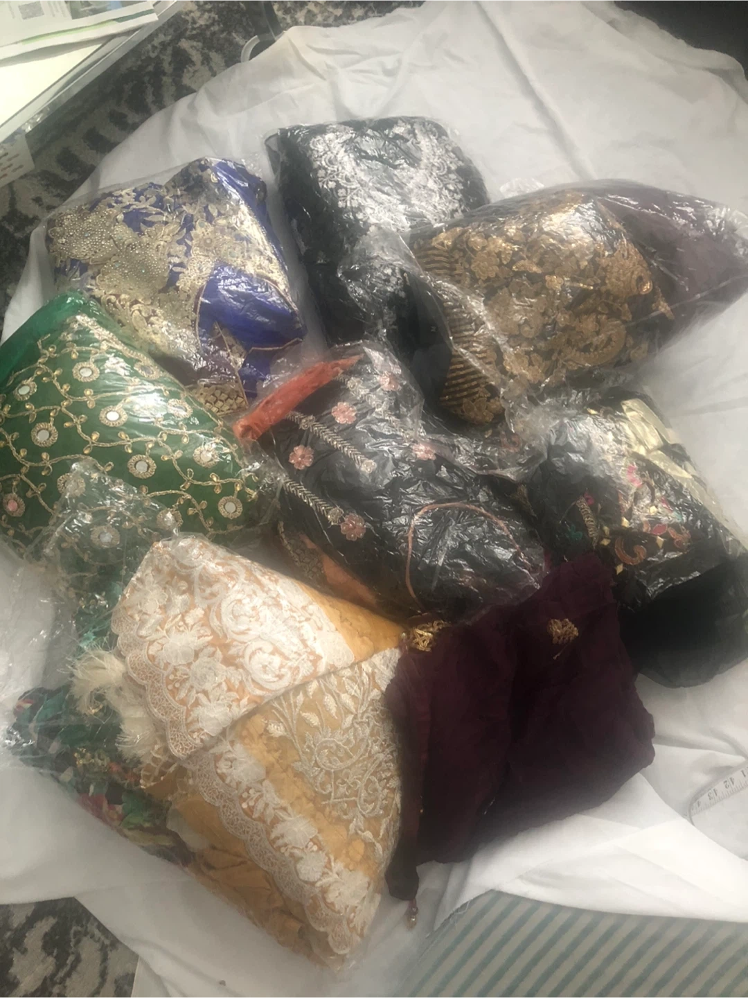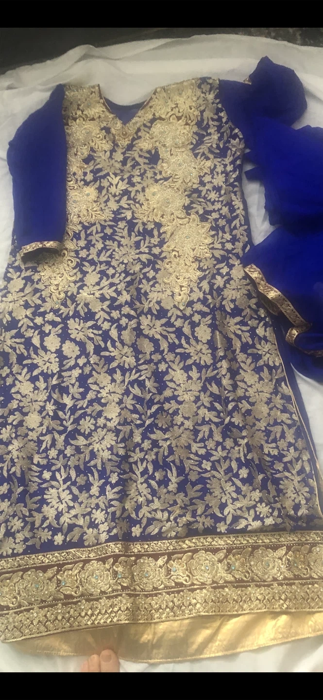 Collection of ornate salwar kameez suits. Each piece features intricate embroidery and embellishments, with matching dupattas and bottoms included. Various colours and designs available for festive occasions.