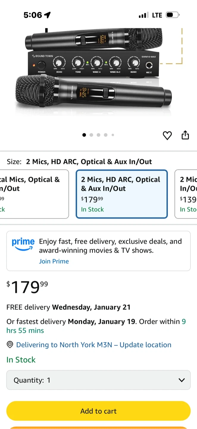 This is a Sound Town SWM16-Pro wireless microphone system. It includes two microphones, a receiver, and various cables for connection. The system supports HDMI ARC and optical audio inputs.