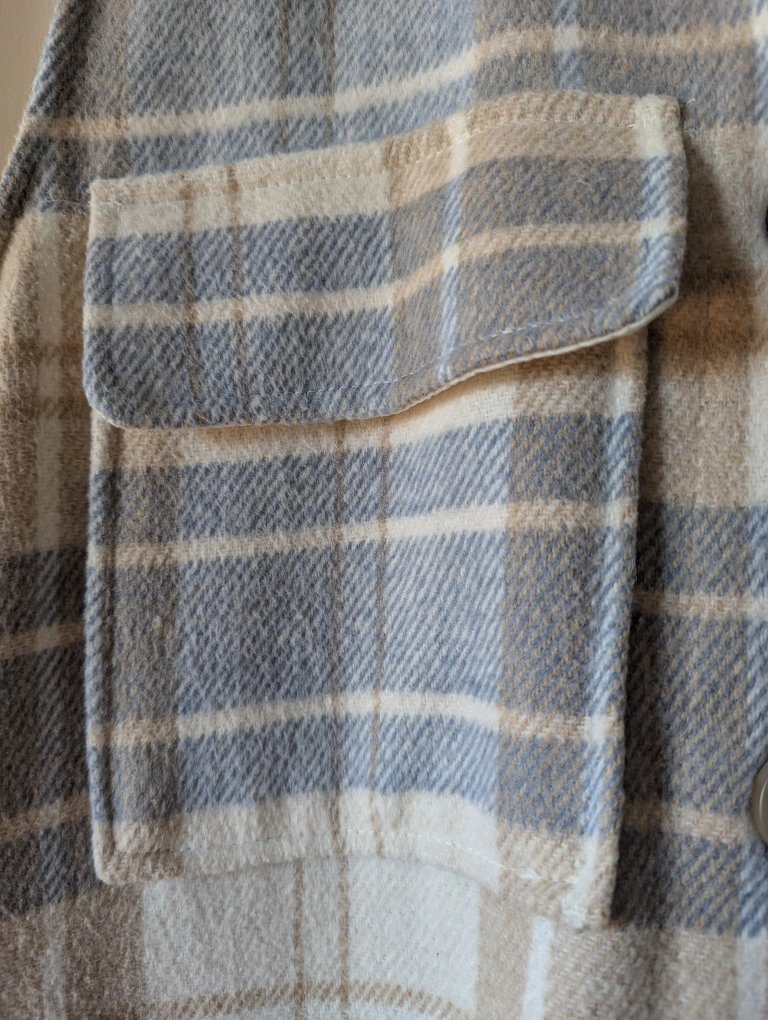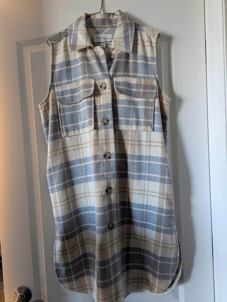 The shirt has a button-up front, two front pockets, two side pockets and a stylish plaid pattern. This calf length vest is perfect for layering or wearing on its own during warmer weather