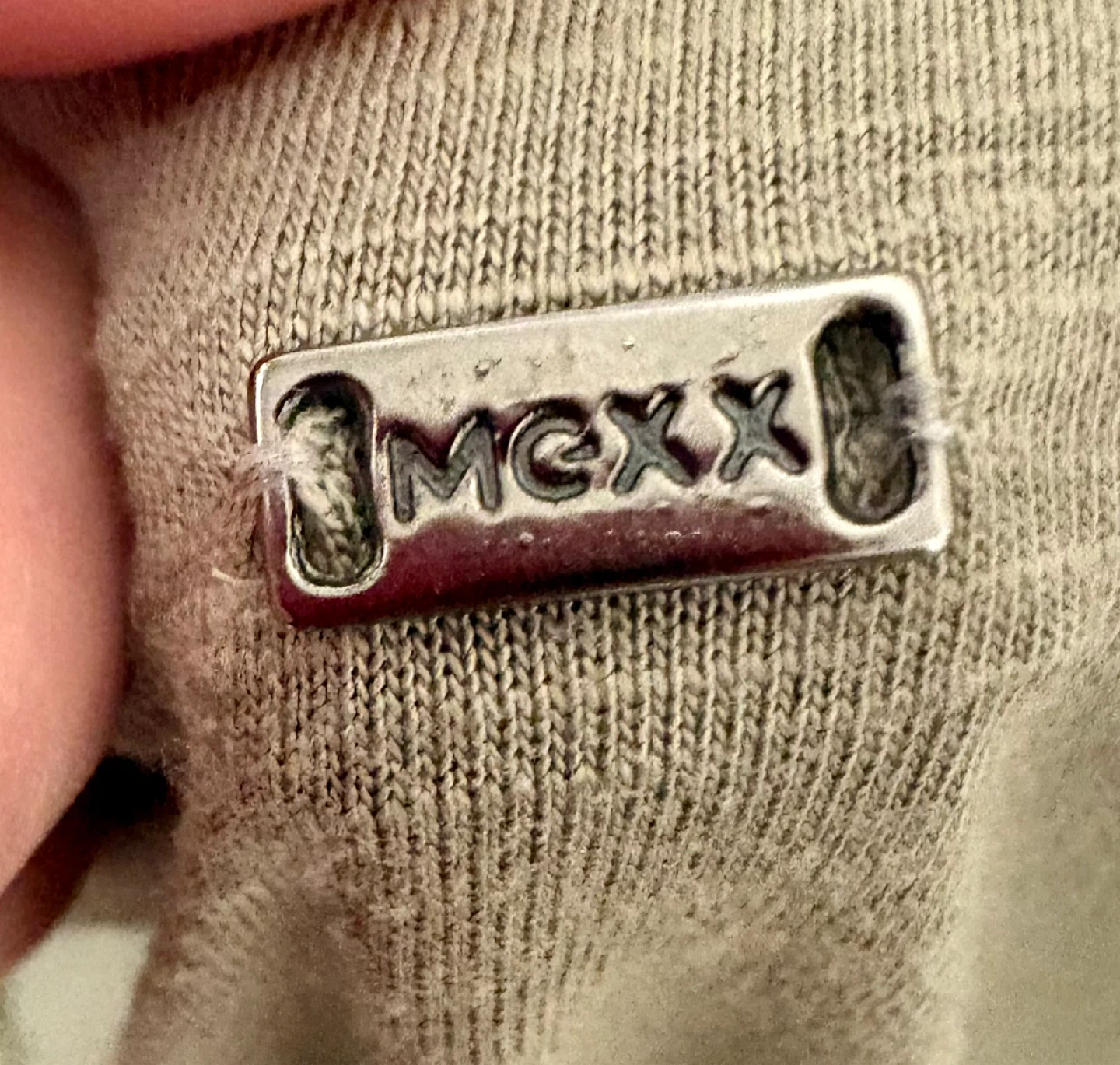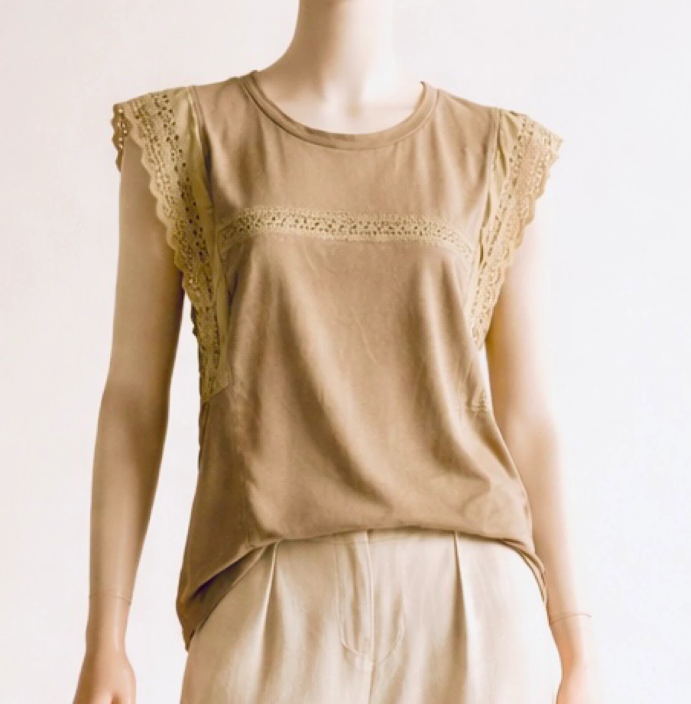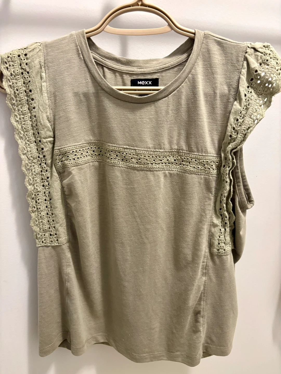 Stylish Mexx top. Light brown/khaki/Green in color with pretty lace detail on sleeves and across chest. Round neck. Super comfy. Size Large