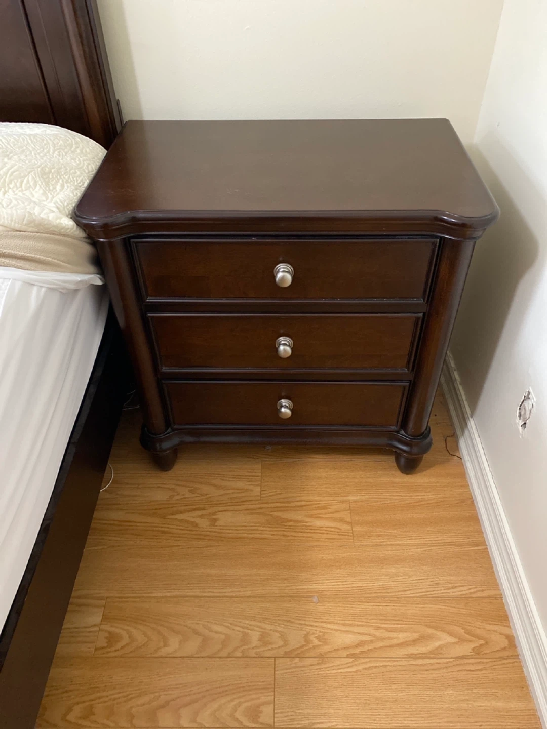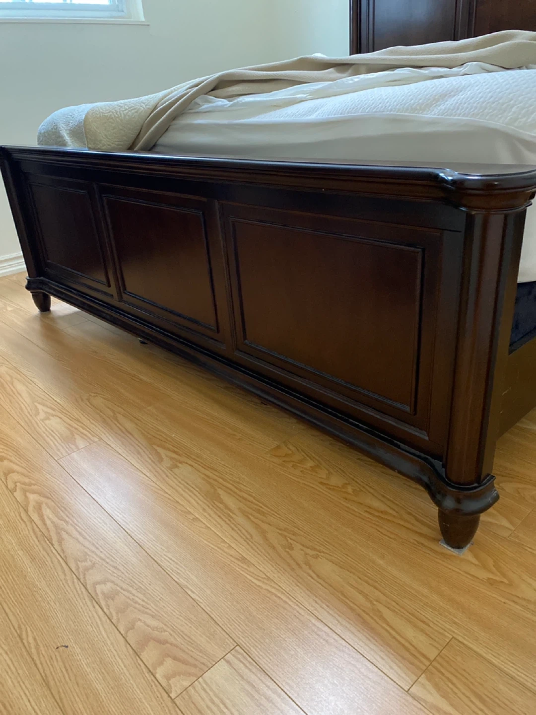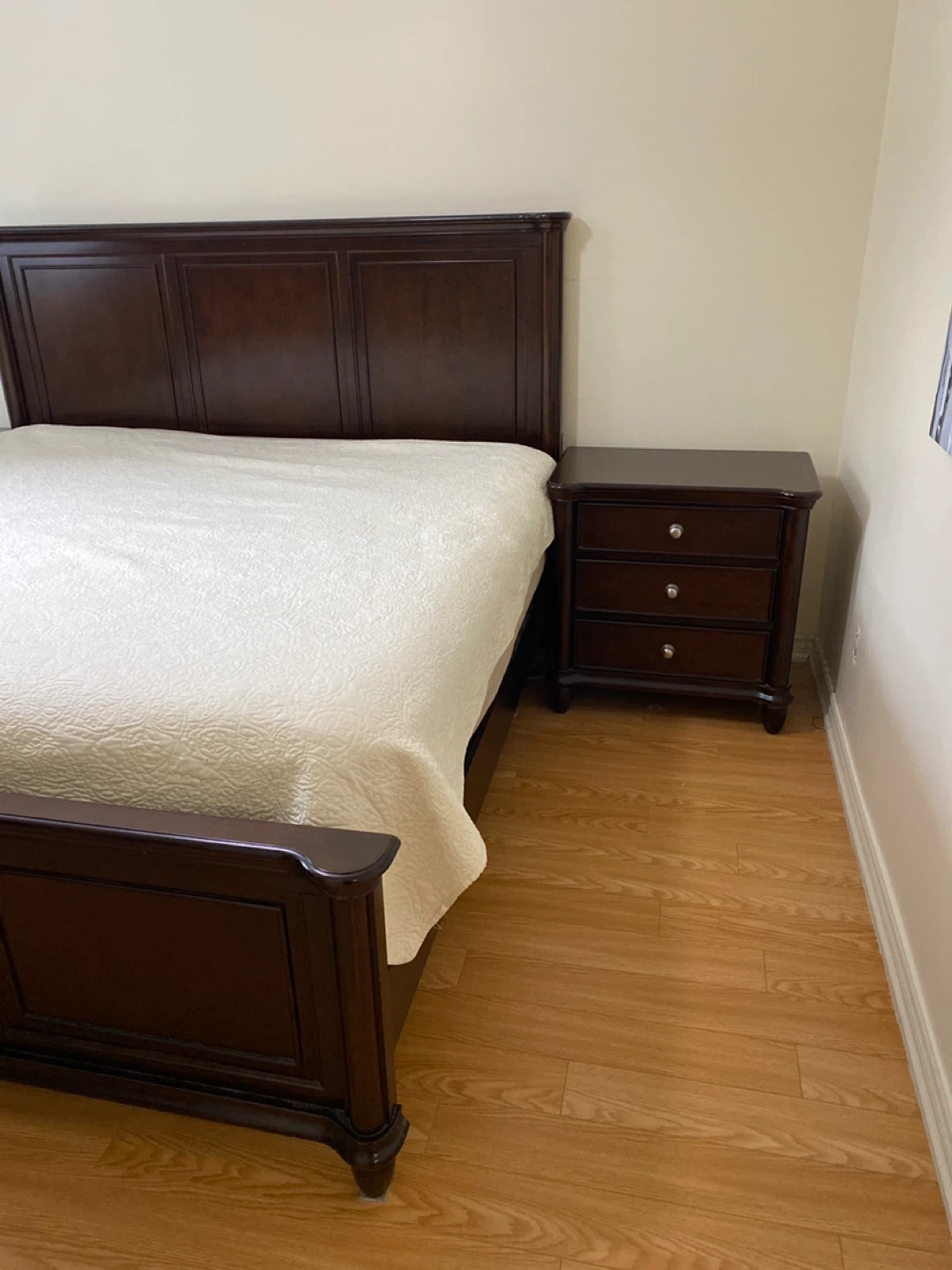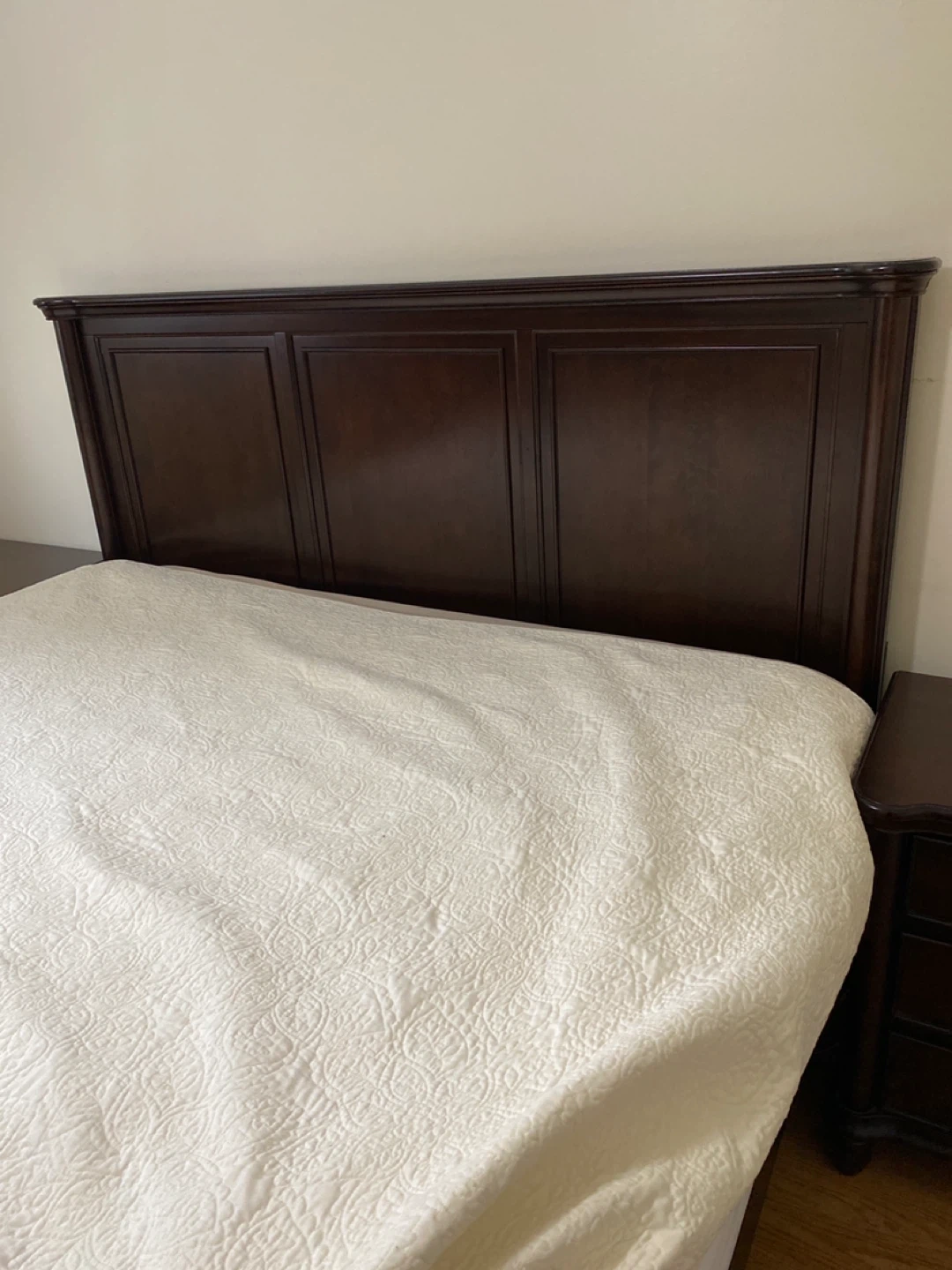 This is a quality King Size Bedroom Set that includes the two end tables, the head board and footboard, split box frame with slats, including king koil Classic princess mattress. This set is in extremely great condition, is a top mattress and is from a pet free and smoke free home. Mattress measures 76 inches w X 78 inches l X 12 inches high plus the split box underneath. Will include set of sheets.