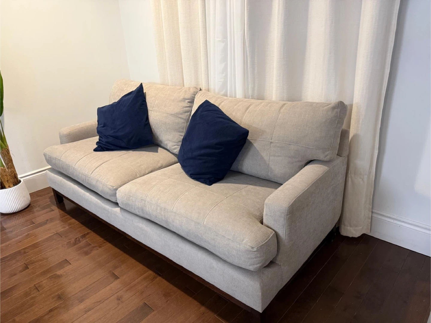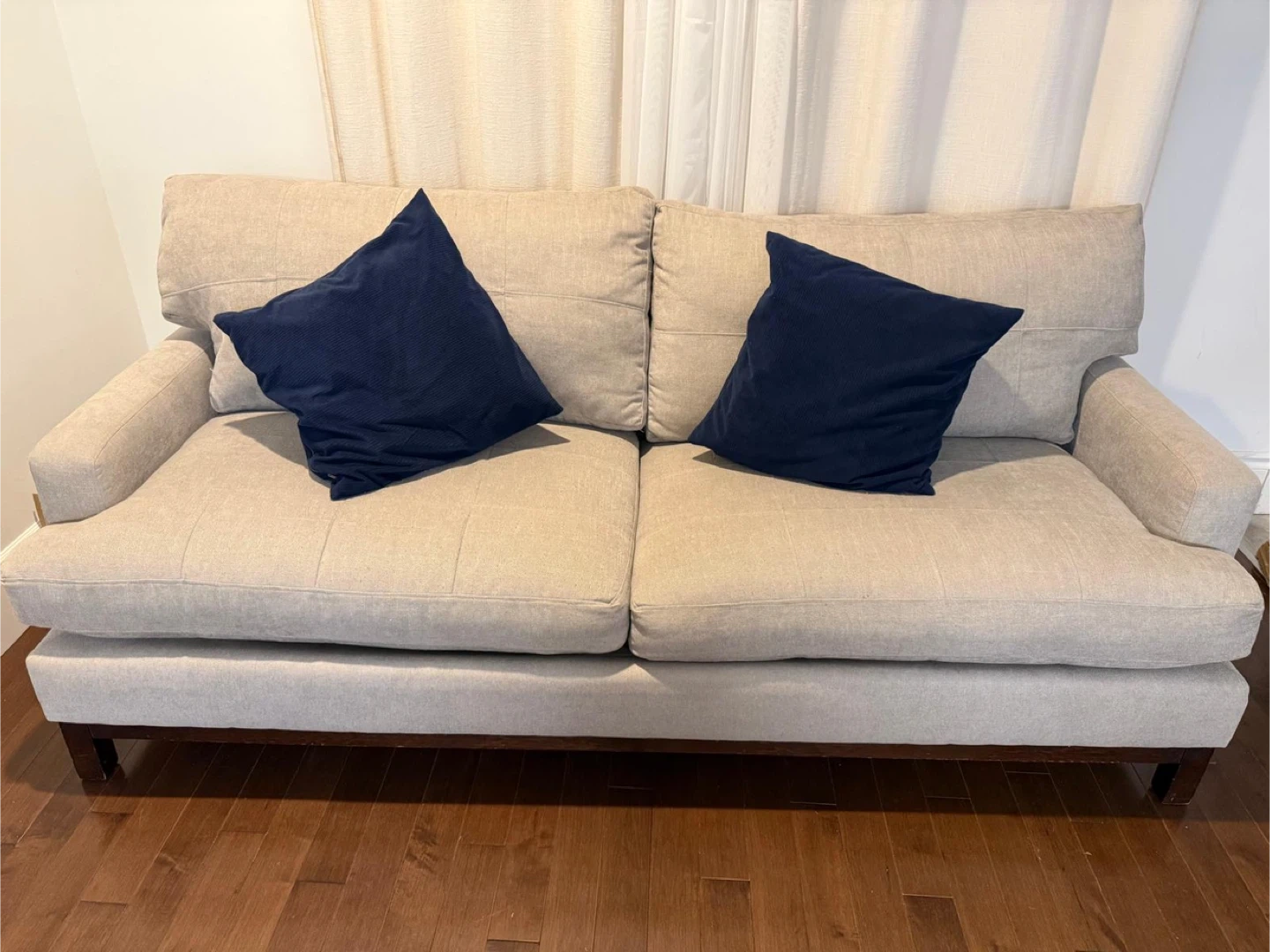 A comfortable beige loveseat sofa. It's upholstered in a textured fabric and comes with two navy blue throw pillows. The sofa has dark wood legs.