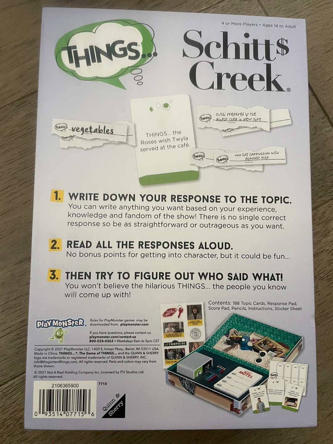 This is the "Things" board game, Schitt's Creek Edition. It includes 188 Topic Cards, Response Pad, Score Pad, Pencils, and a Sticker Sheet. It's for ages 14 to adult and 4 or more players.