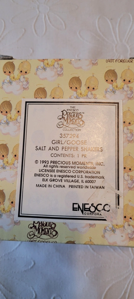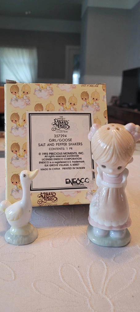 1 set of Salt and Pepper shakers still in original box . Never used & in perfect condition featuring "The Girl and a Goose. "