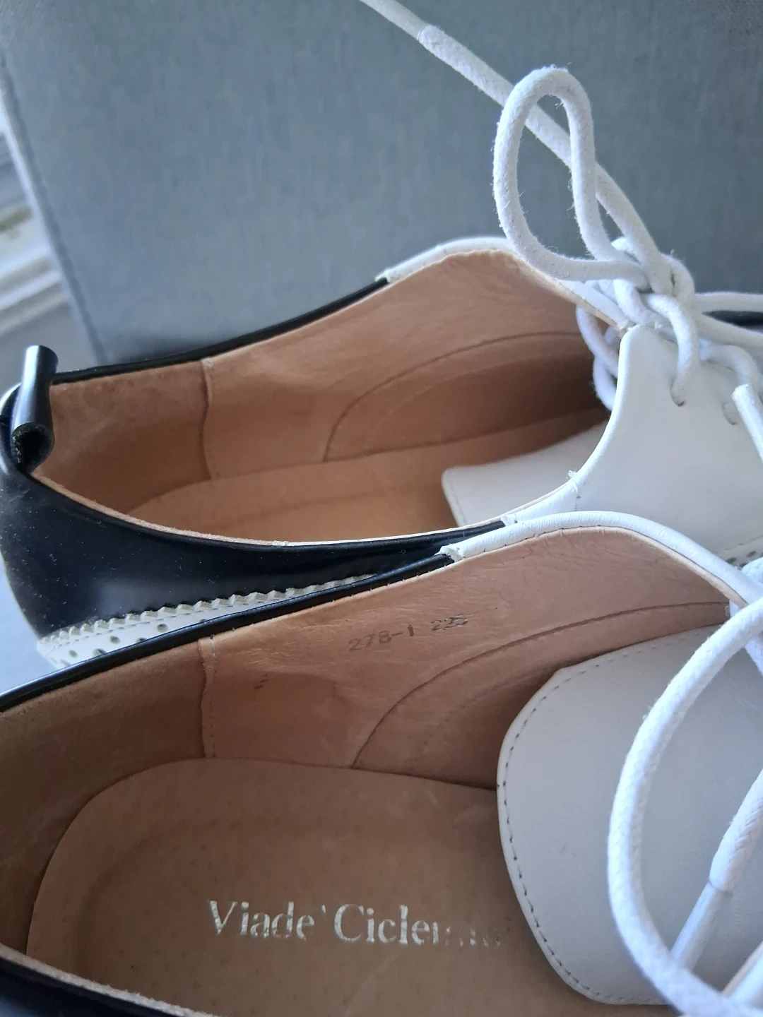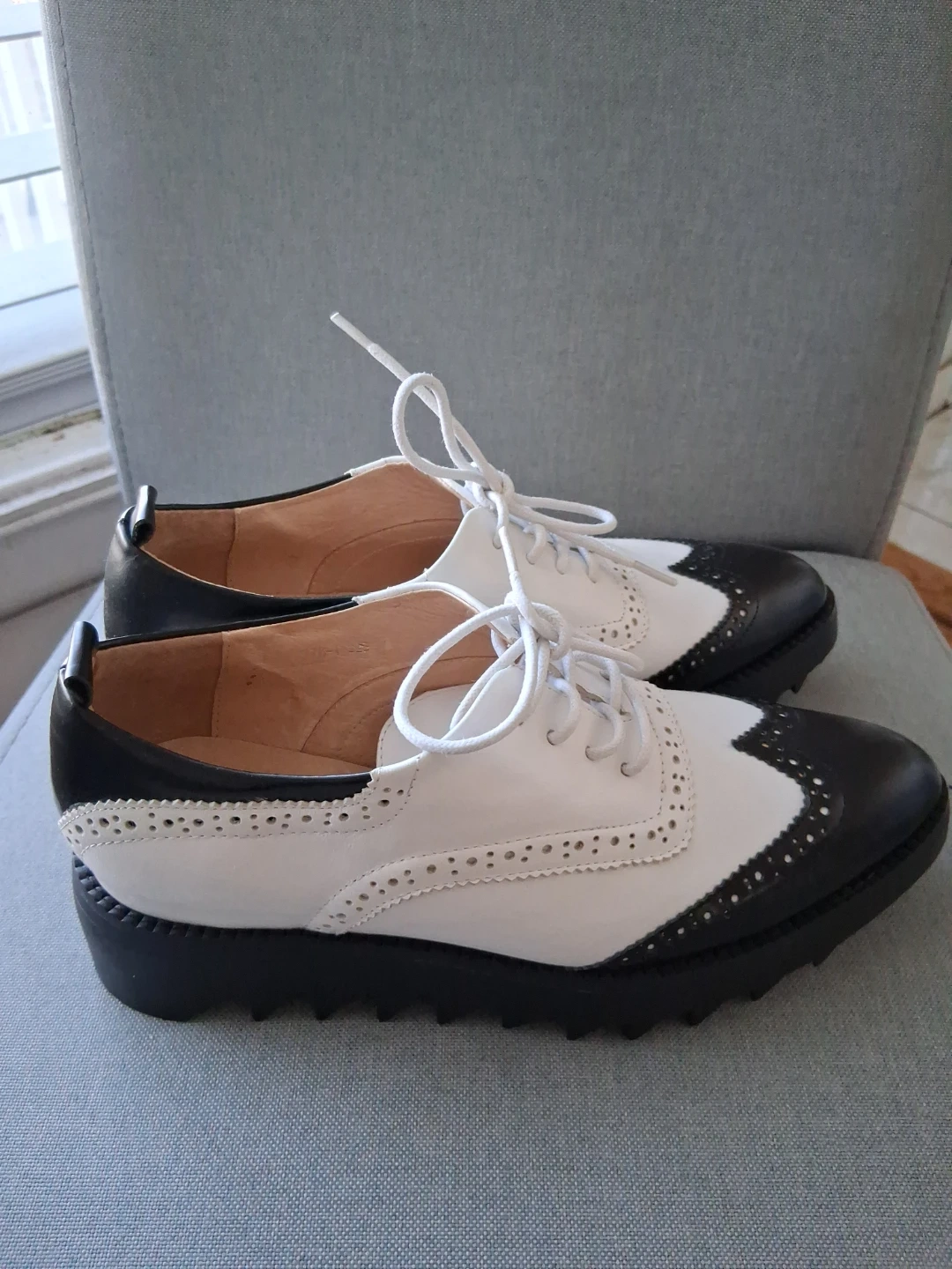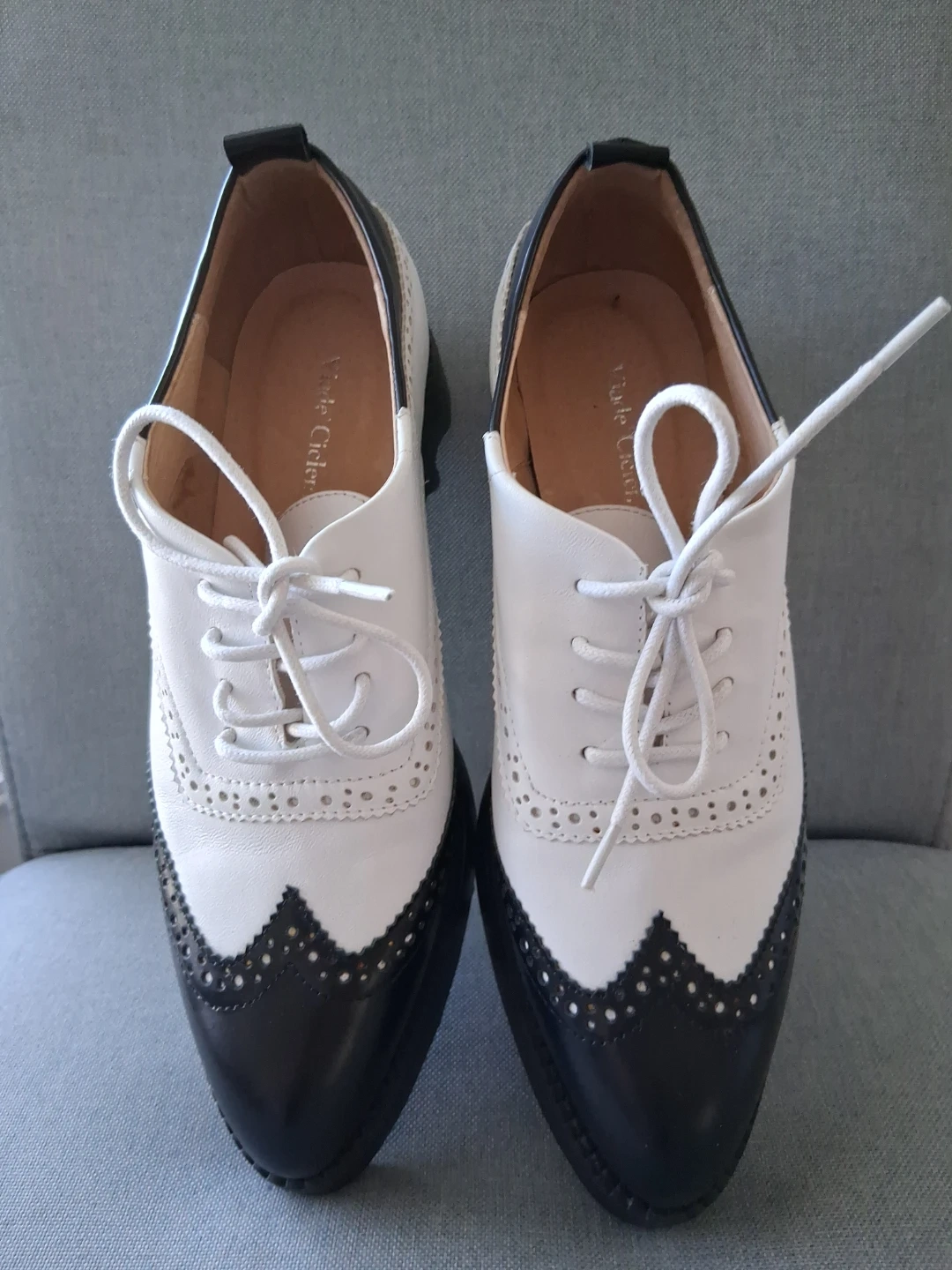 Chic black and white wingtip oxford shoes from Viade Ciclemens. These lace-up oxfords feature a classic brogue detailing and a sturdy lug sole. Leather upper and lining. Never worn. Too small. ๐๐