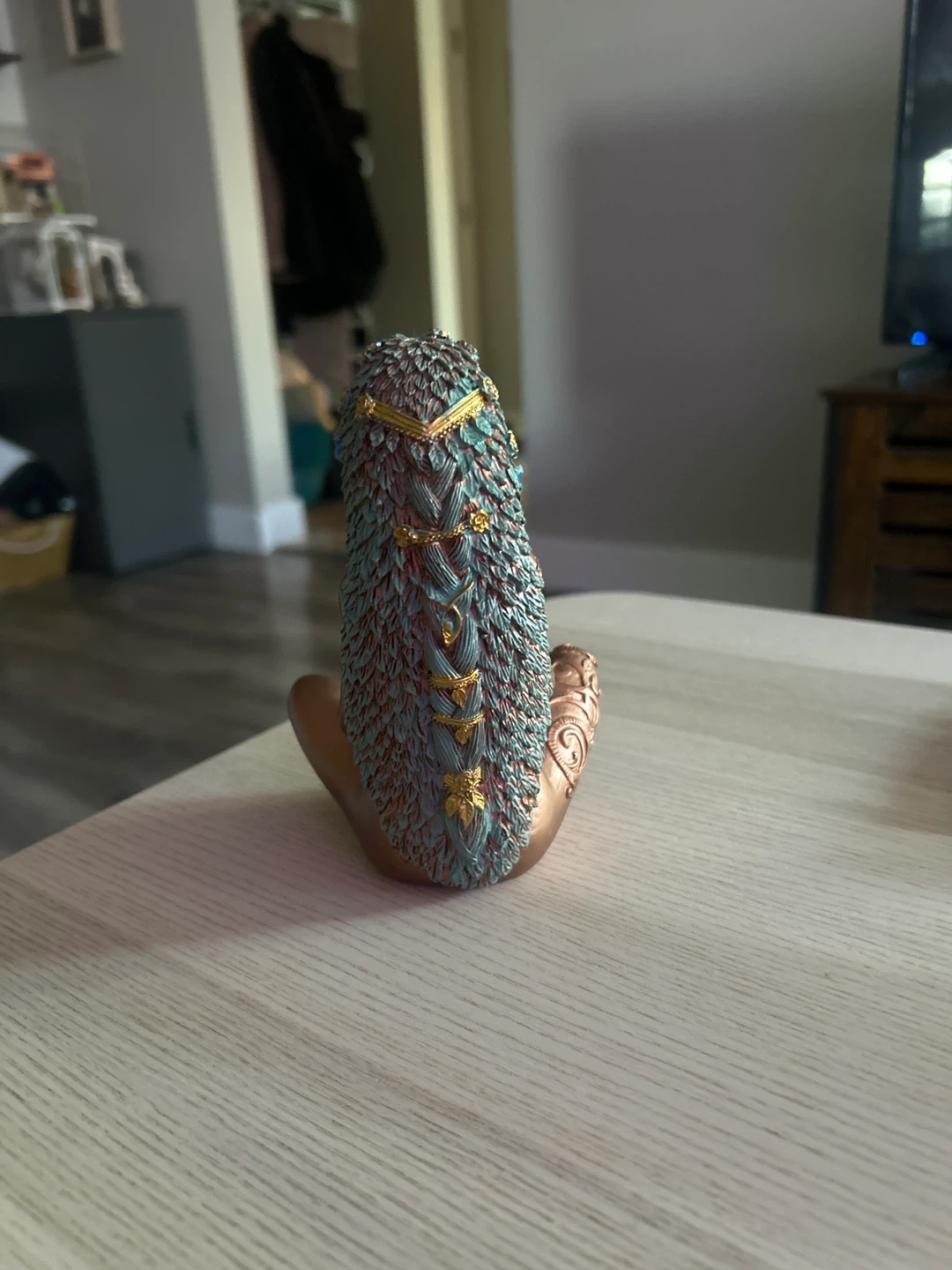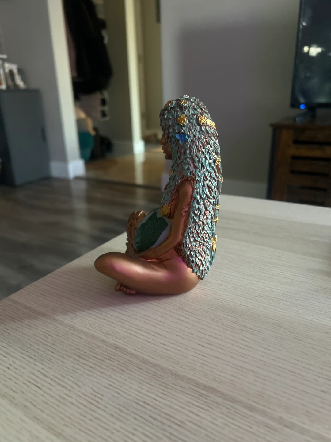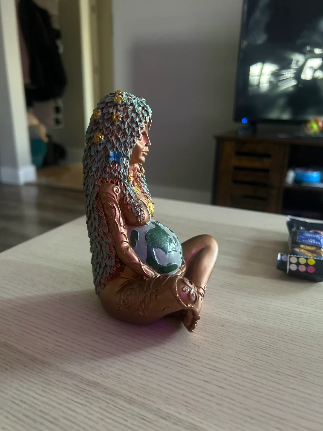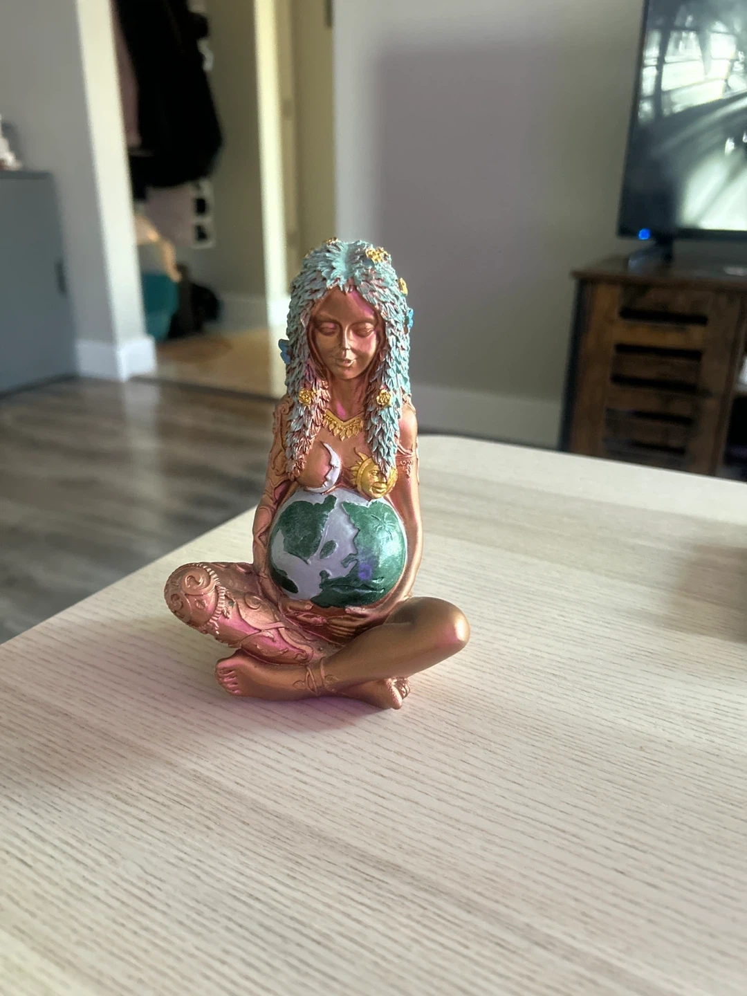A decorative figurine depicting Mother Earth holding the planet as her pregnant belly. It has intricate details on her hair and body, with a metallic bronze and teal finish.