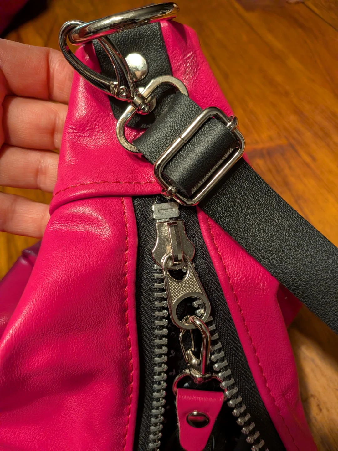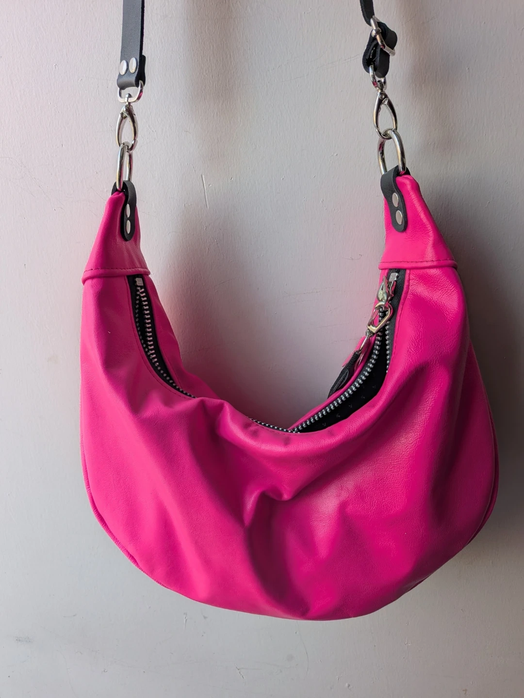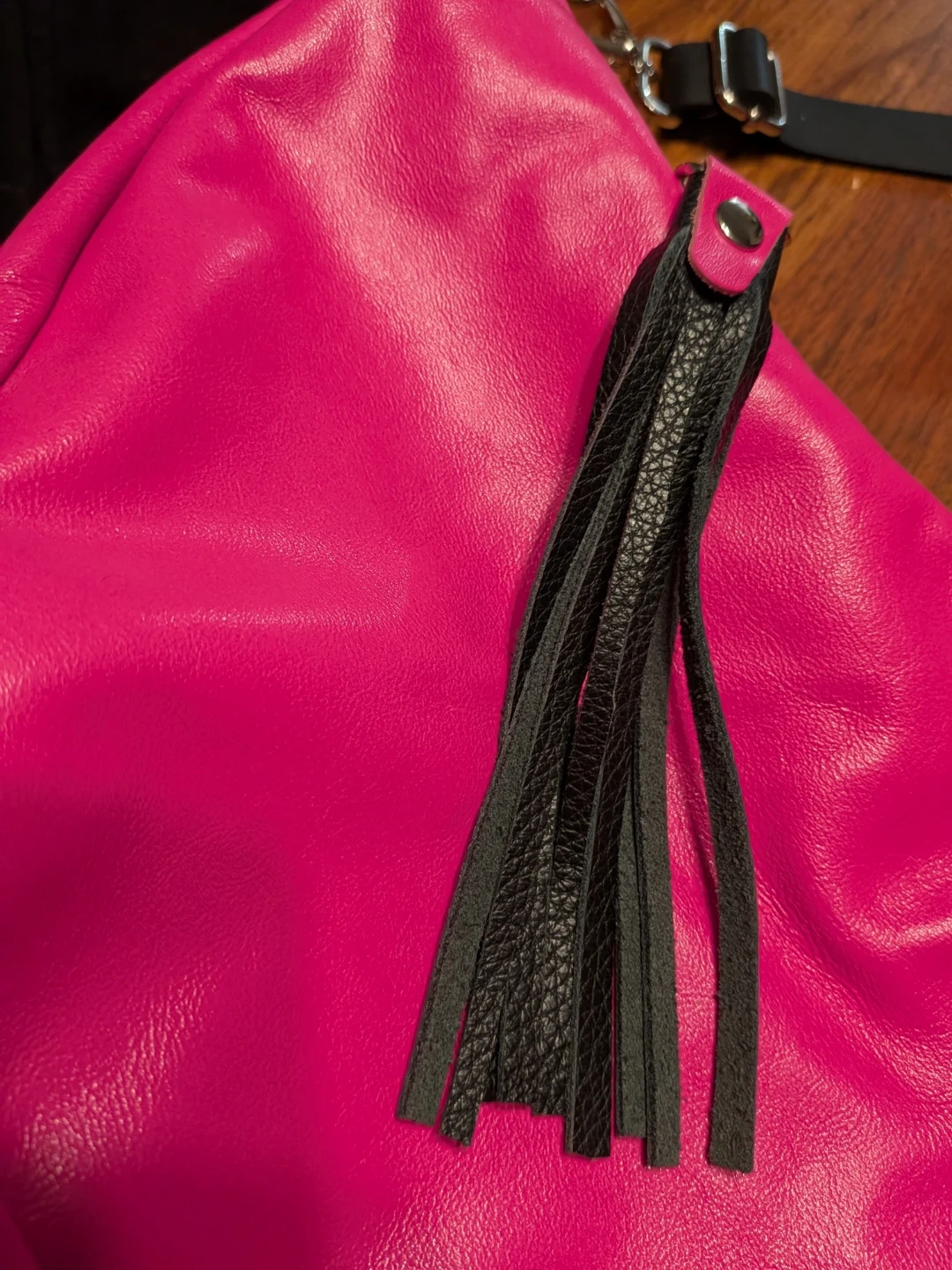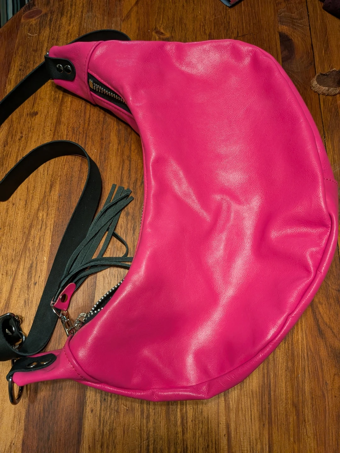 This local designer stylish shoulder bag features a vibrant hot pink colour and a unique crescent shape. It's crafted from faux leather and includes decorative black leather tassels for a touch of flair. The interior lining has a subtle pattern.