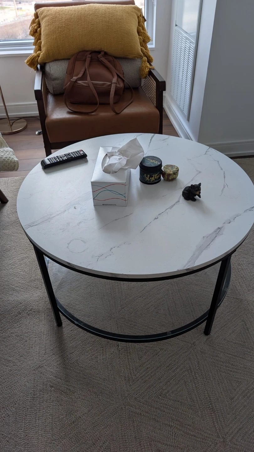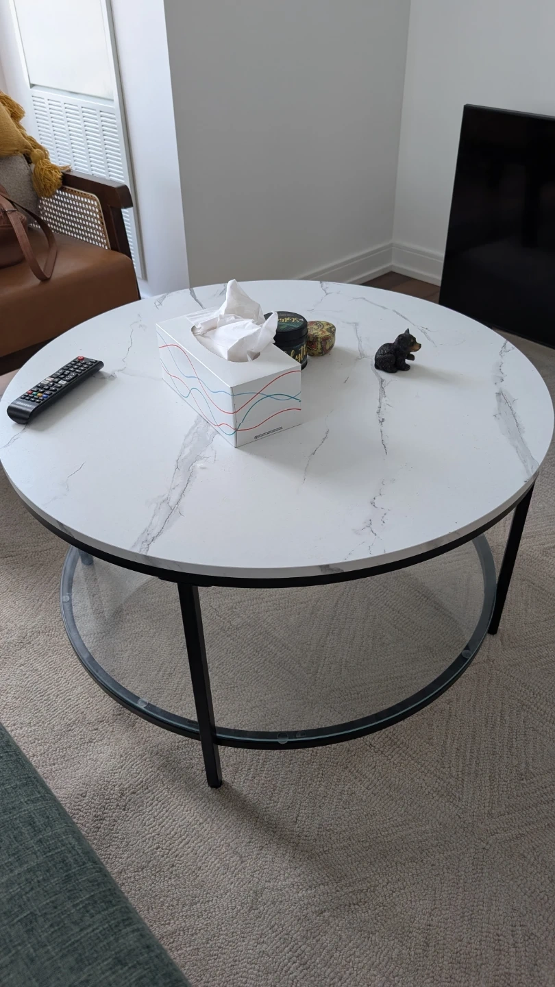 Used for less than two years. A modern round coffee table with a white marble-look top and black metal legs. It's a nice size for a living room. This table would be great for holding drinks and decor. Must pick up by end of April from Kipling.