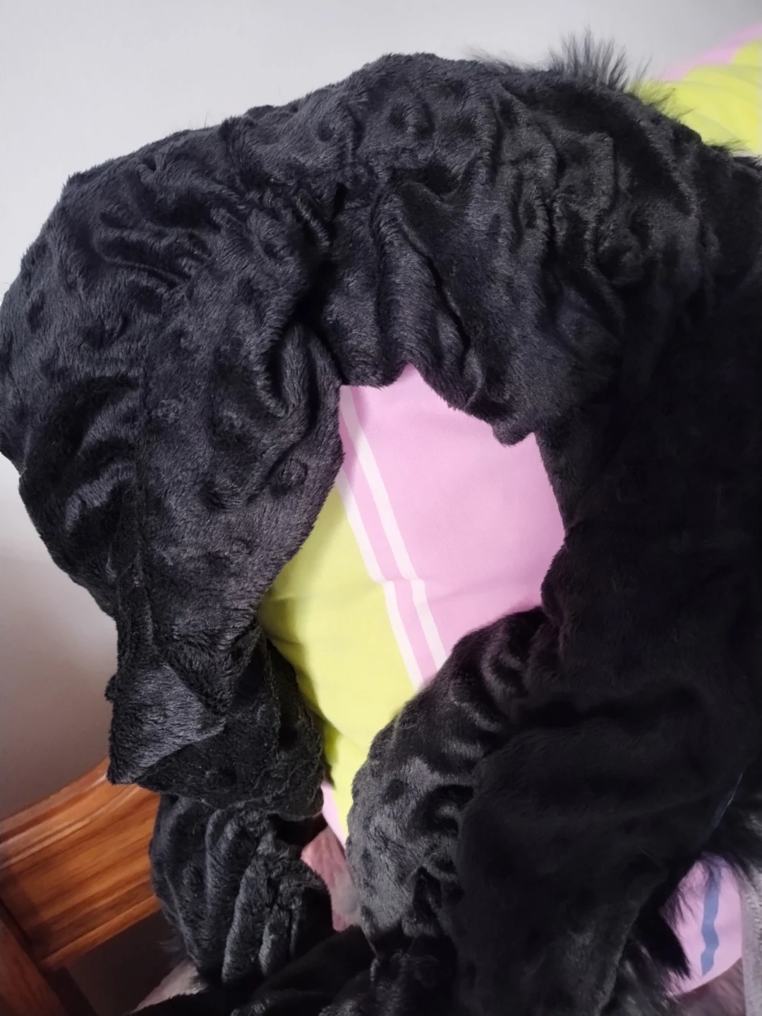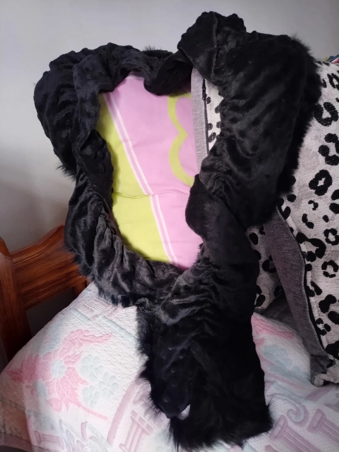 Cozy black scarf made from soft faux fur with a subtle embossed dot pattern. It has fuzzy trim along the edges. Great for adding warmth and style on a chilly day!