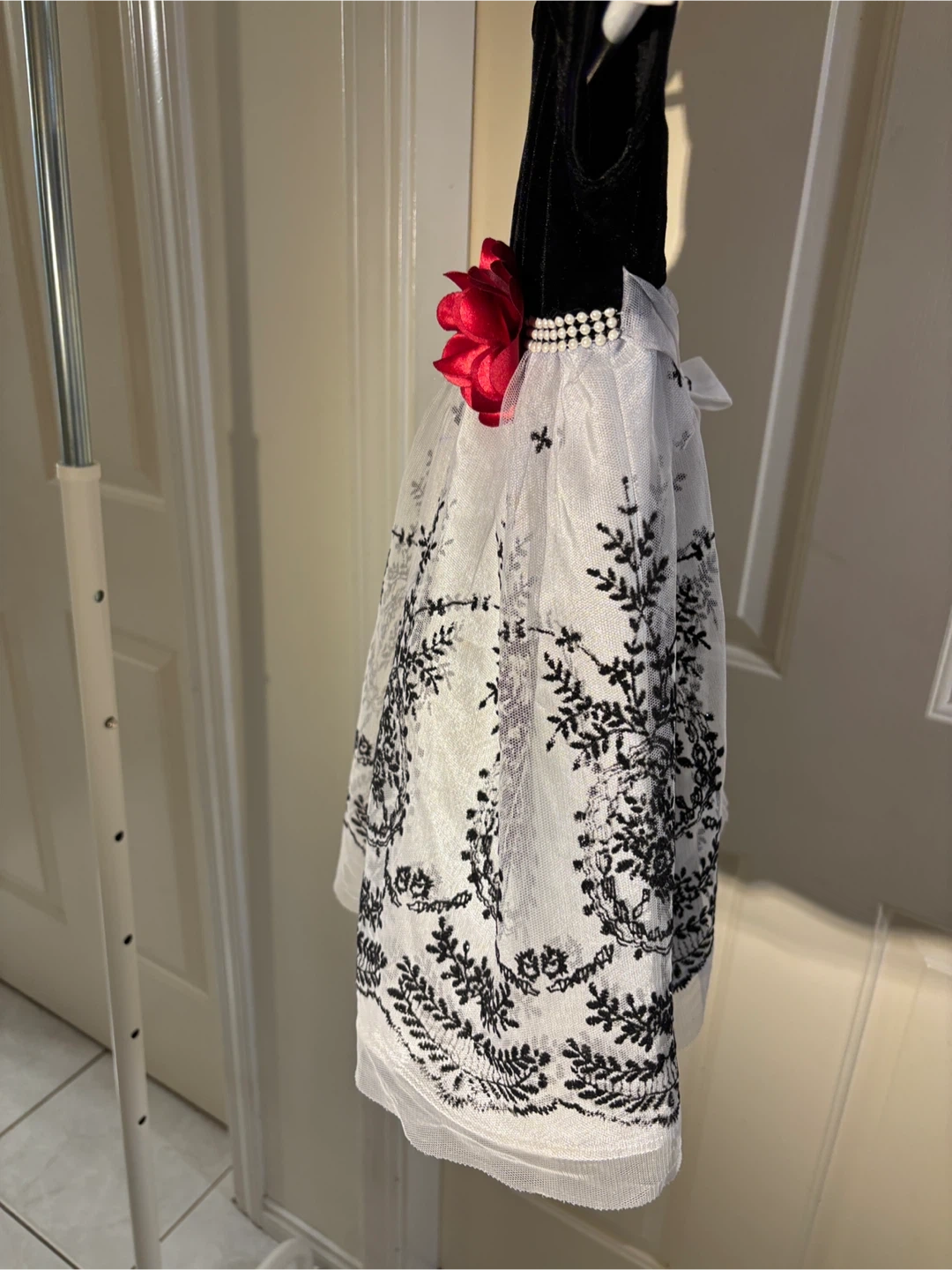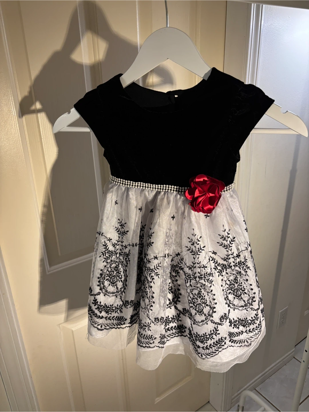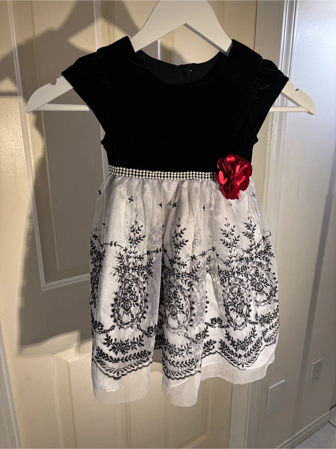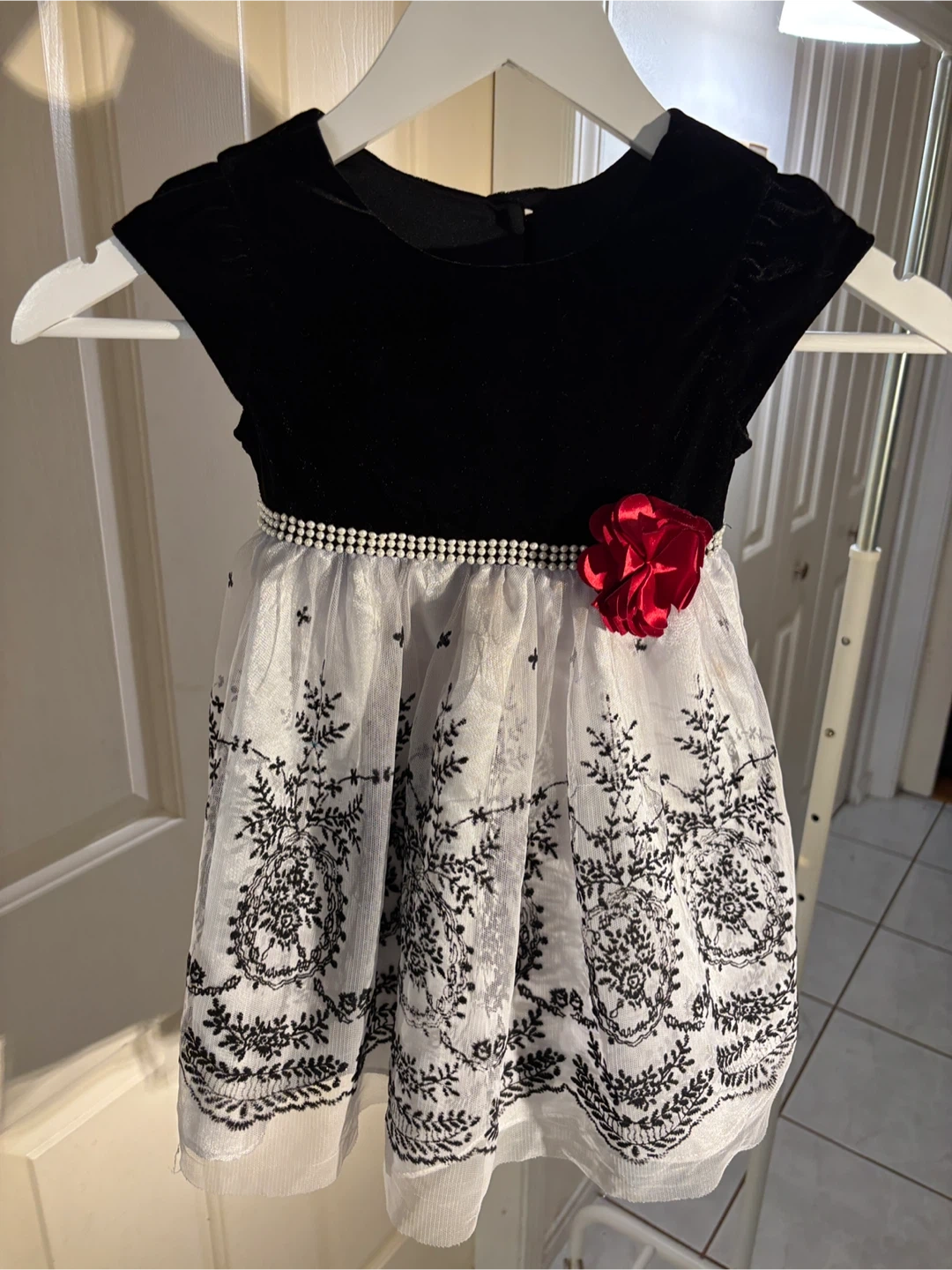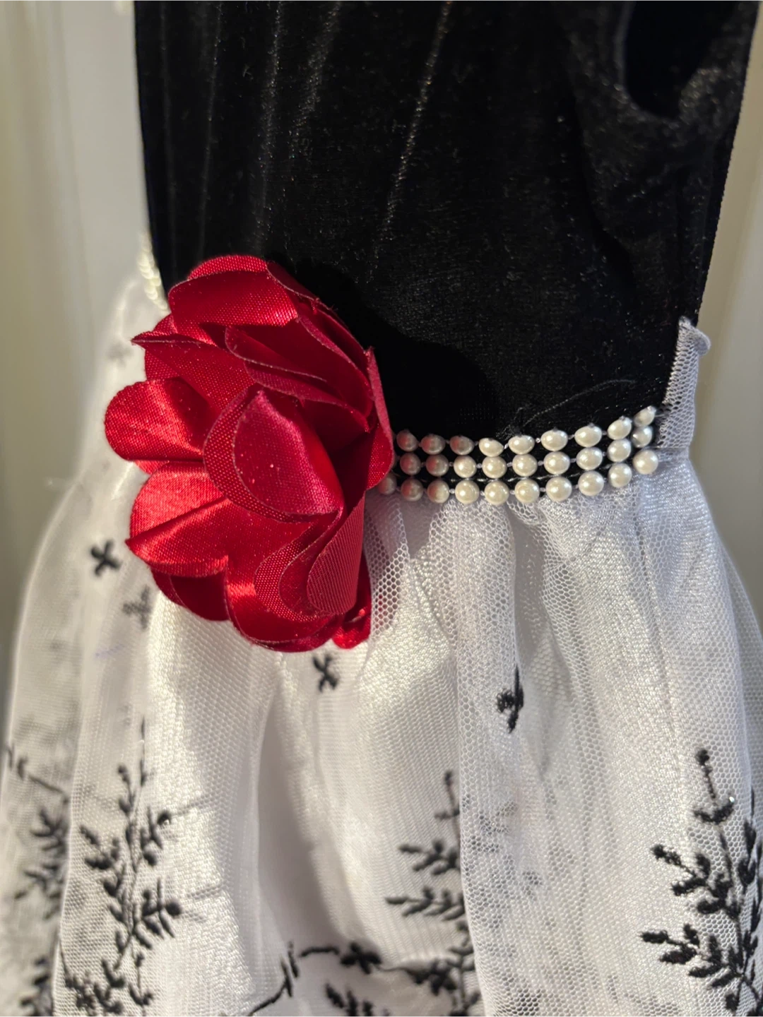 A beautiful elegant dress perfect for the holidays, weddings, or special occasions 🌟This lovely piece features a soft black velvet bodice, a pearl-accented waistband adorned with a cranberry coloured flower 🌹