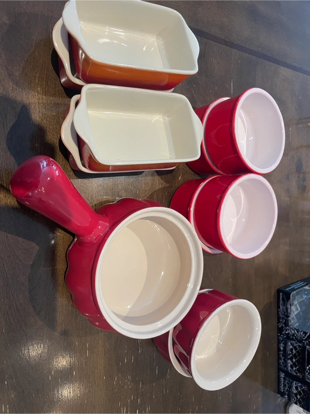 This set includes one large red pot with a handle, two small orange rectangular dishes, and four small red ramekins. It's made of durable ceramic material. These are perfect for individual servings or small batch baking!
