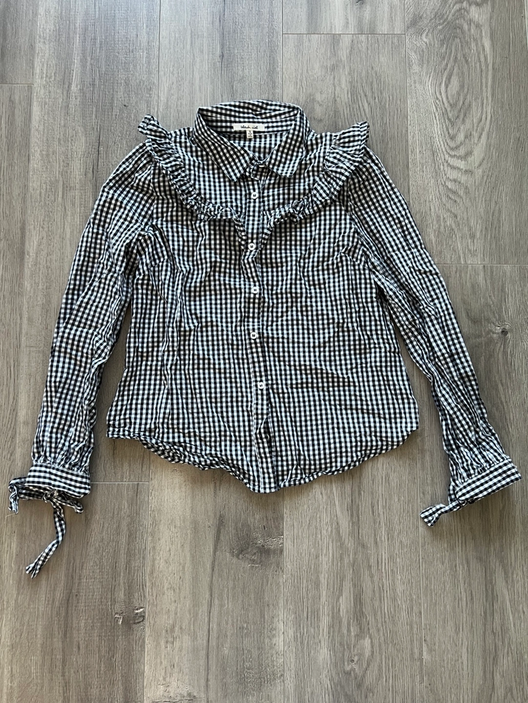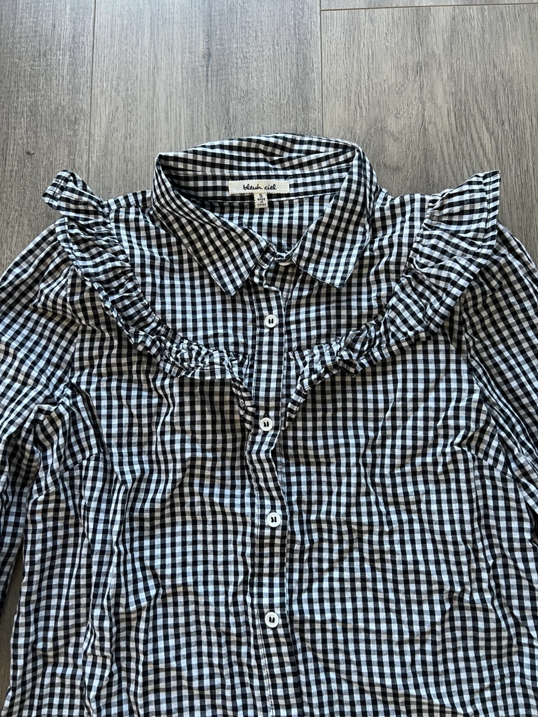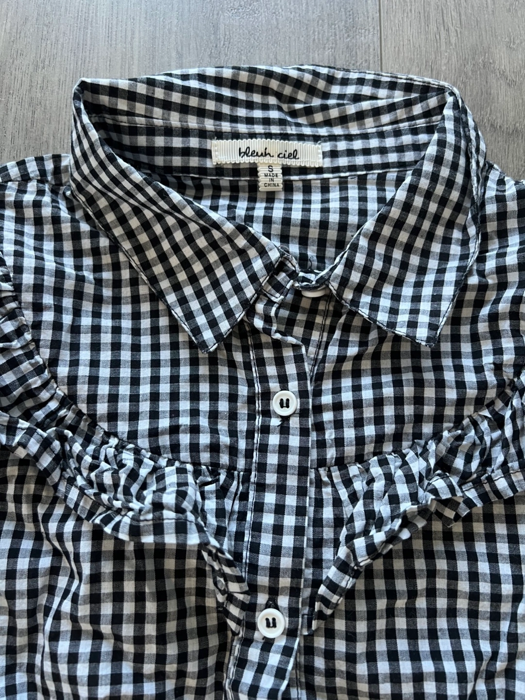 Women's size small long sleeve button-down shirt. Features a gingham pattern, ruffle detailing at the shoulders, and tie-able cuffs. Bleuh ciel brand XS/ S