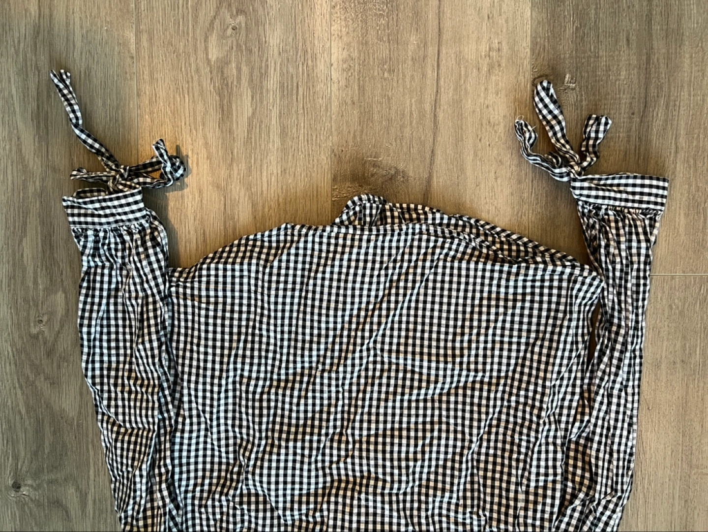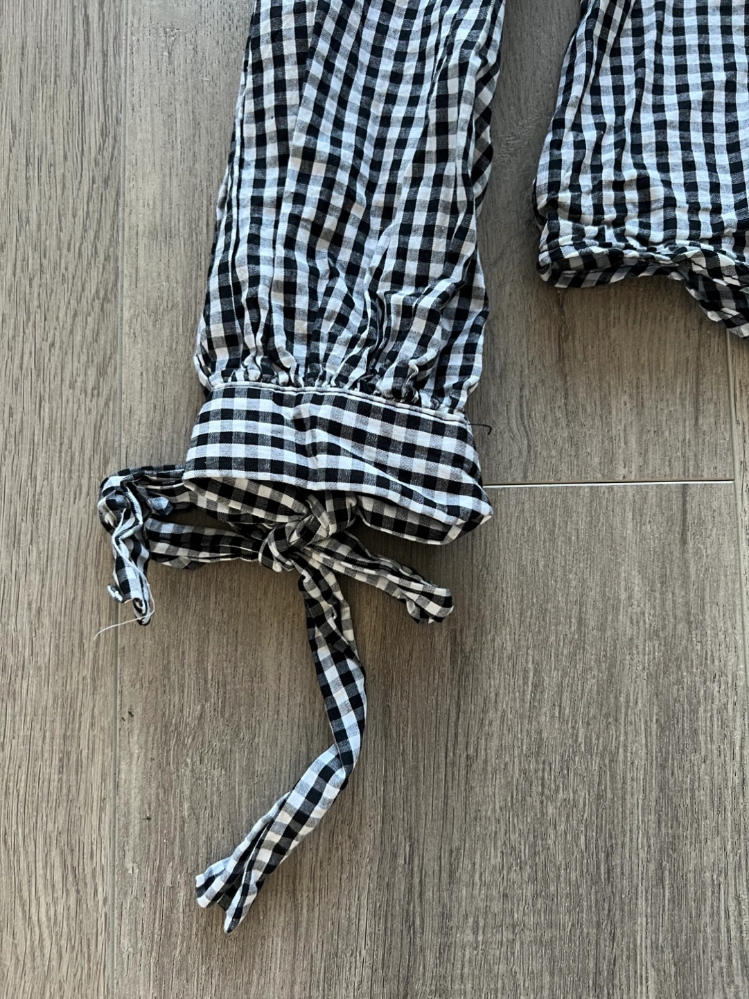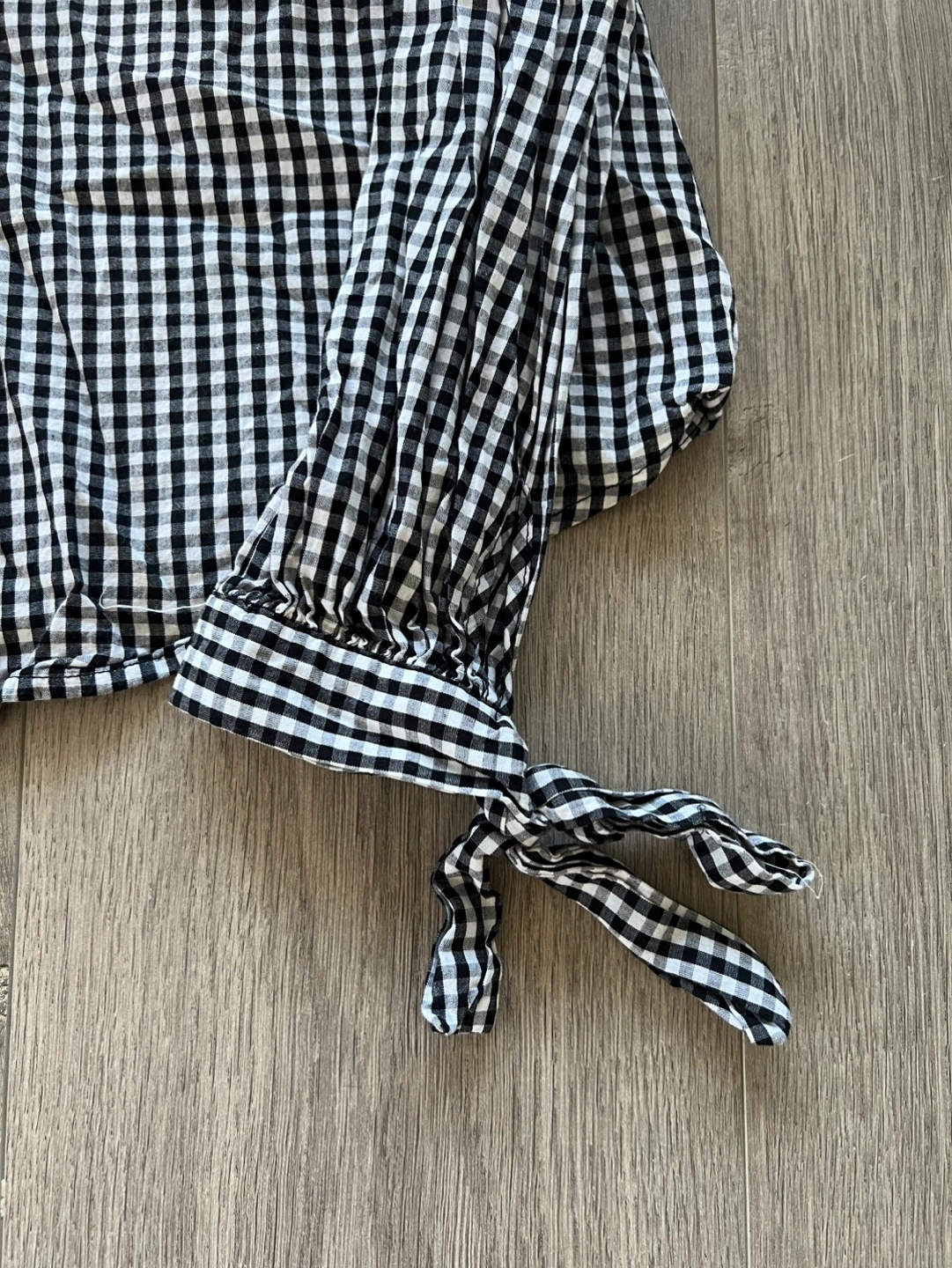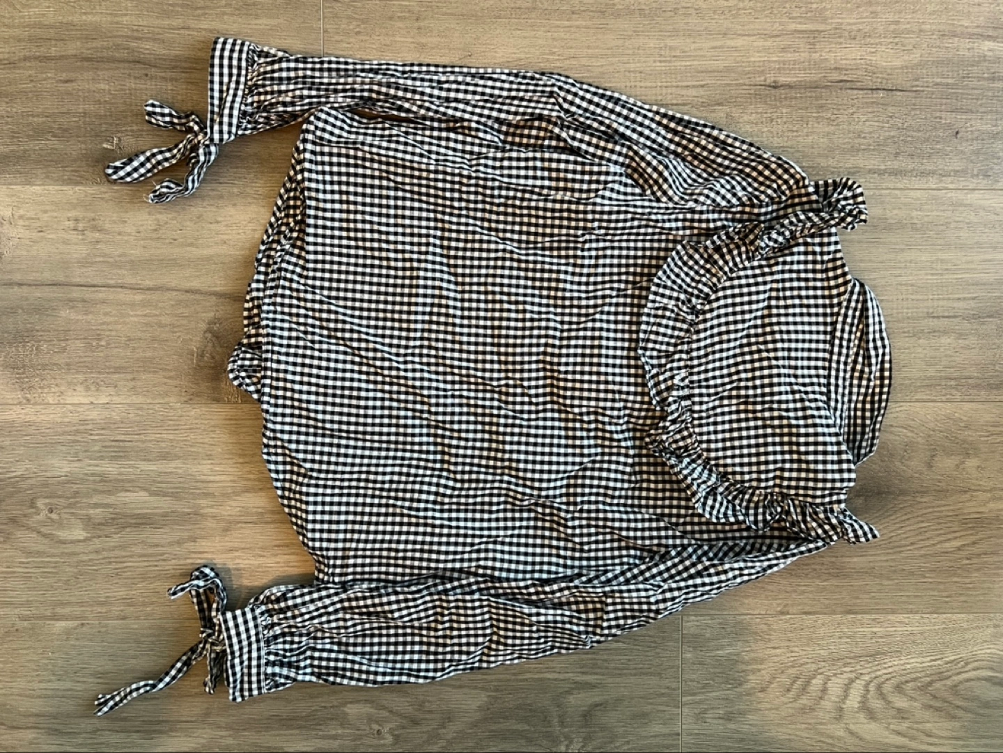 Women's size small long sleeve button-down shirt. Features a gingham pattern, ruffle detailing at the shoulders, and tie-able cuffs. Bleuh ciel brand XS/ S