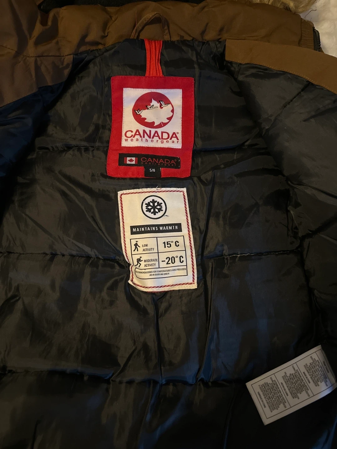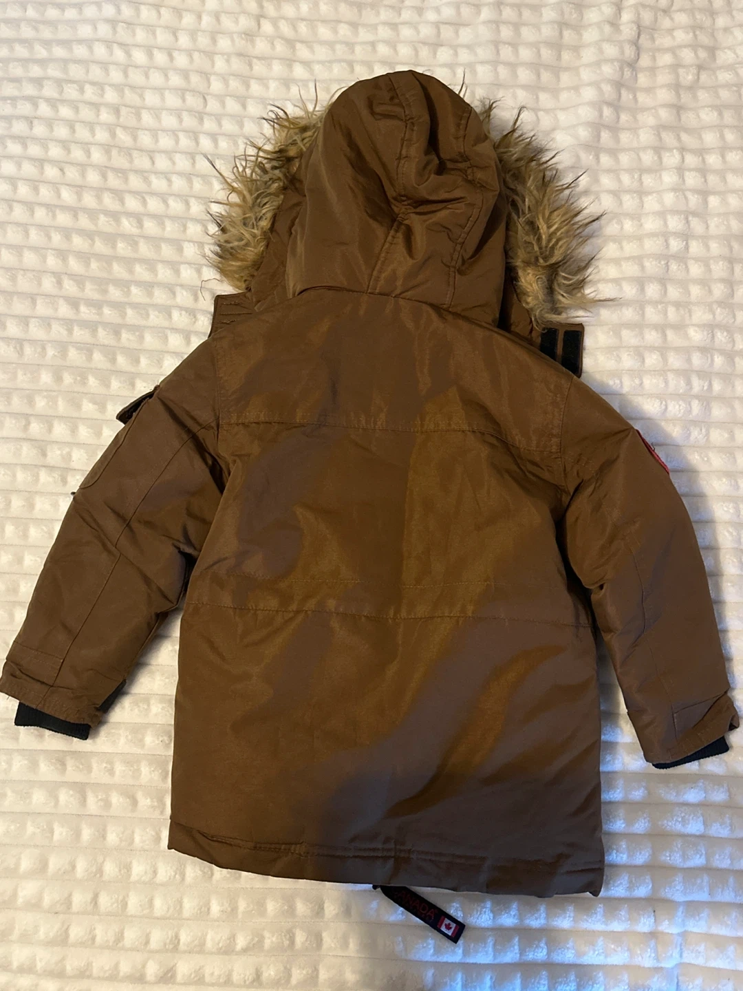 Boys Canada Weathergear insulated parka in a warm brown. Features a faux fur-trimmed hood and multiple pockets. Maintains warmth down to -20°C for moderate activity. Size 5/6.