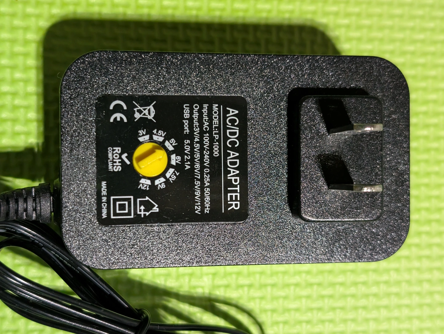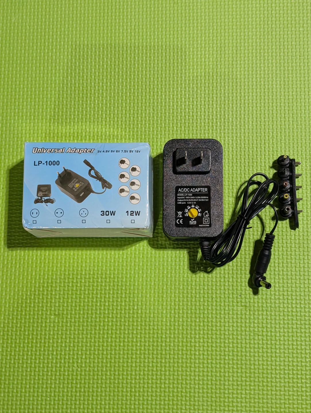 Selling a Universal AC/DC Adapter LP-1000. It supports multiple voltages including 3V, 4.5V, 5V, 6V, 7.5V, 9V and 12V. It comes with multiple adapter tips for different devices and a USB port for 5.0V 2.1A charging.