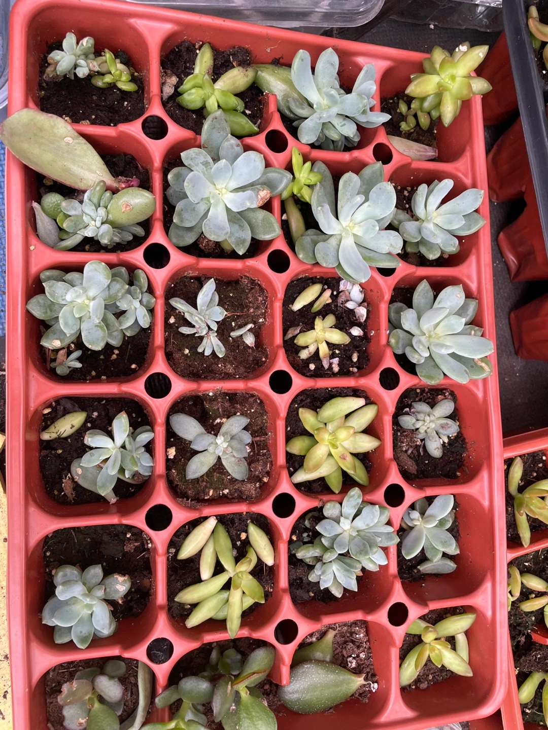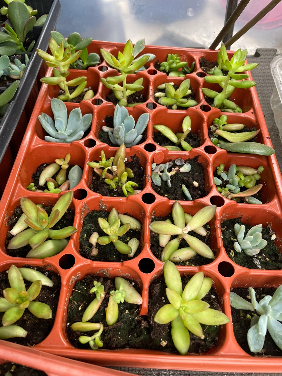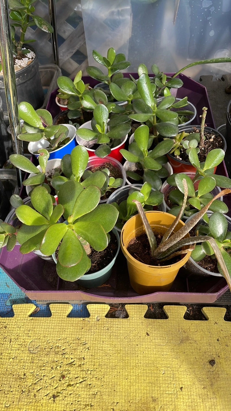 Many succulents for sale. Various sizes and types. Includes jade plants and other succulents. Some in individual pots, others in propagation trays. FROM $5