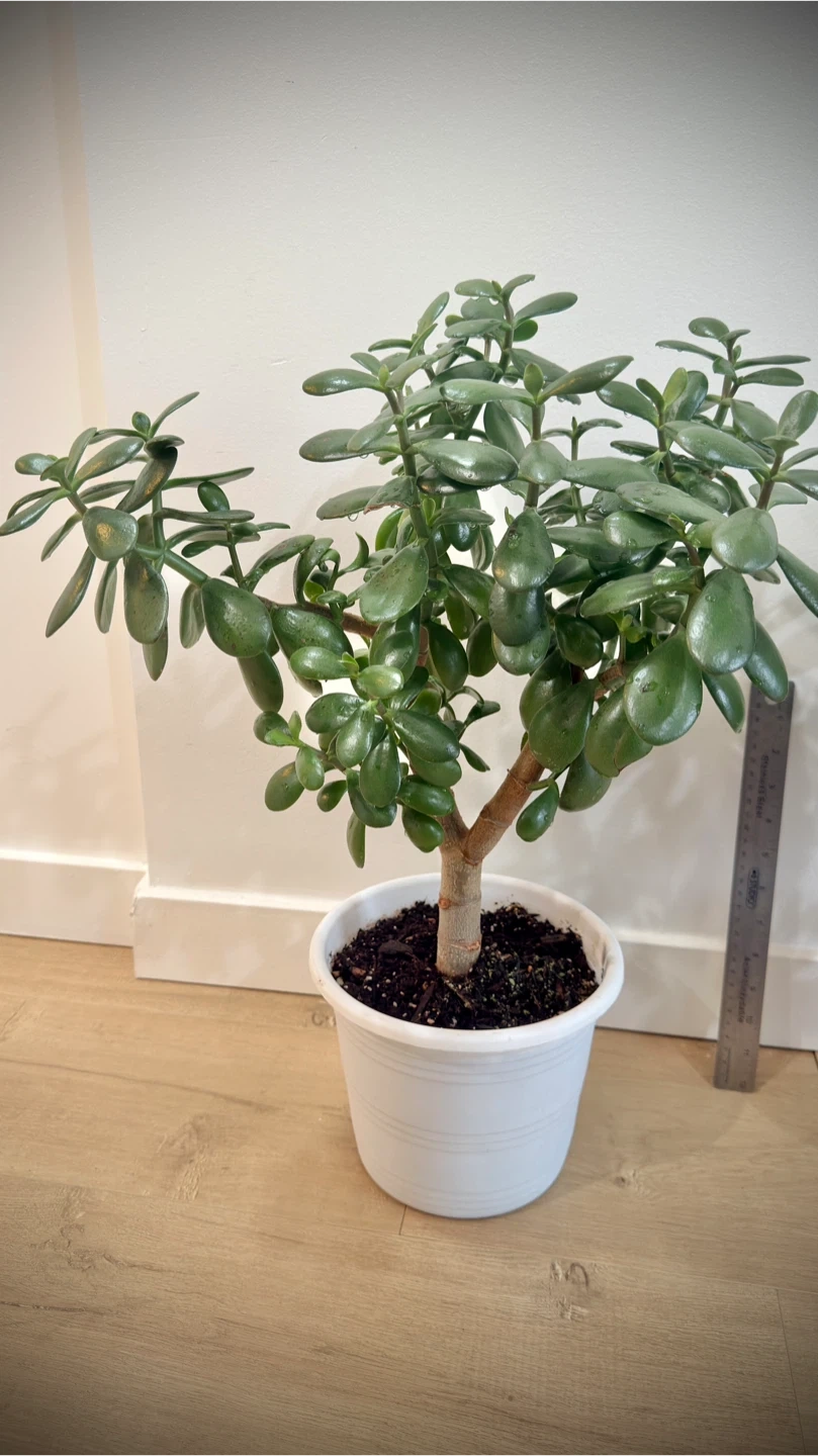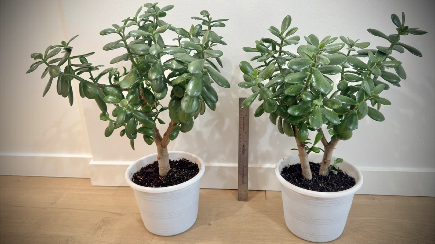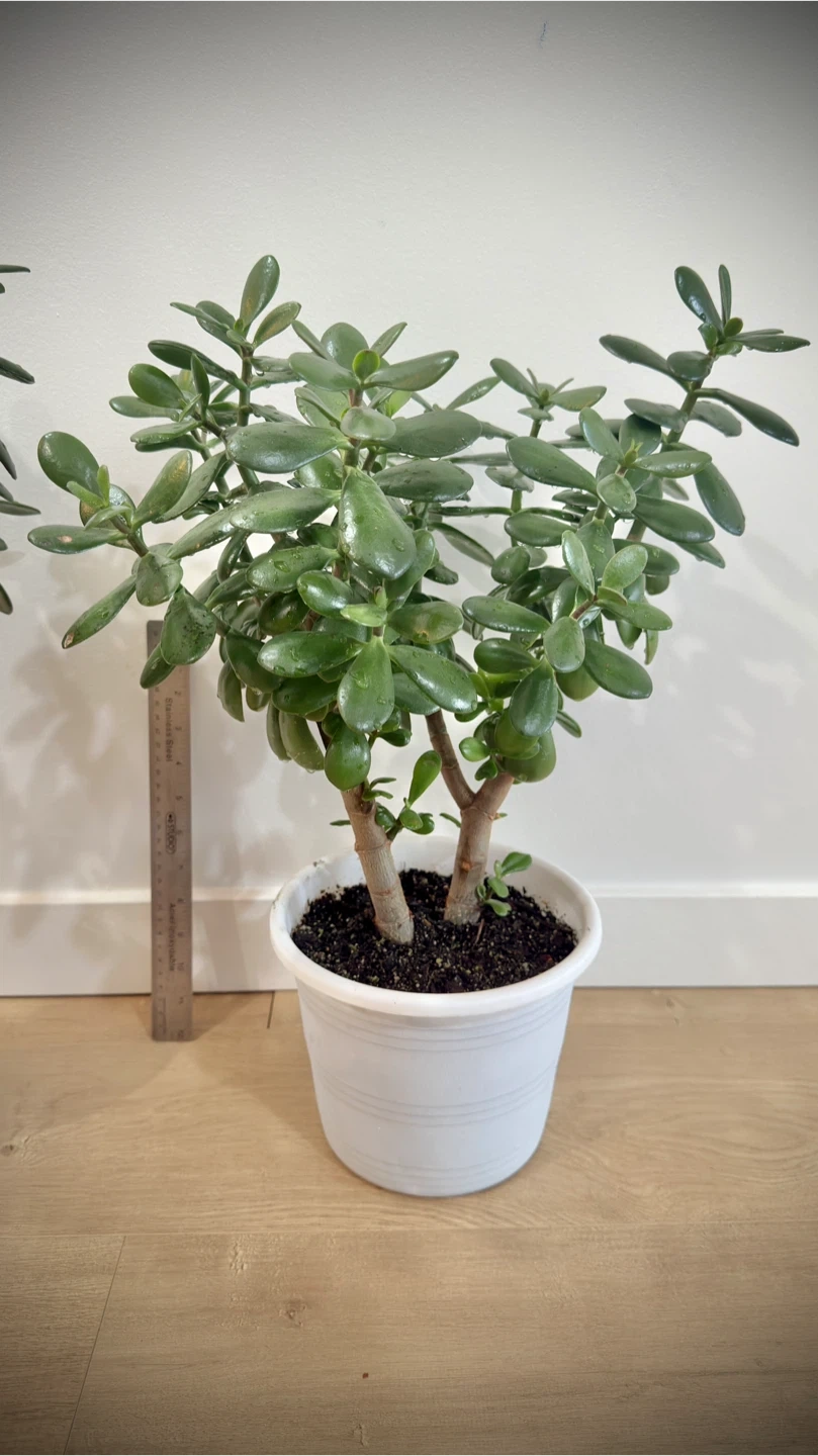 Two healthy Jade plants are included, each potted in a simple white container. These plants are known for their resilience and attractive succulent leaves. They add a touch of greenery to any indoor space.