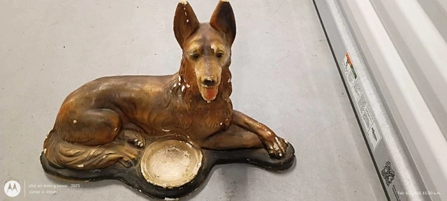 This striking dog statue is a unique piece of home decor, featuring an integrated bowl, possibly for food or water. It's definitely a used item, with some weathering and wear that add to its character. The statue has a distinctive bronze-like finish, with intricate details capturing the dog's form and expression. Material: Likely a composite or resin with a metallic finish. Style: Vintage/antique appearance. This unique statue is waiting for a new home! If the ad is up, yes, it's still available! Cash accepted.