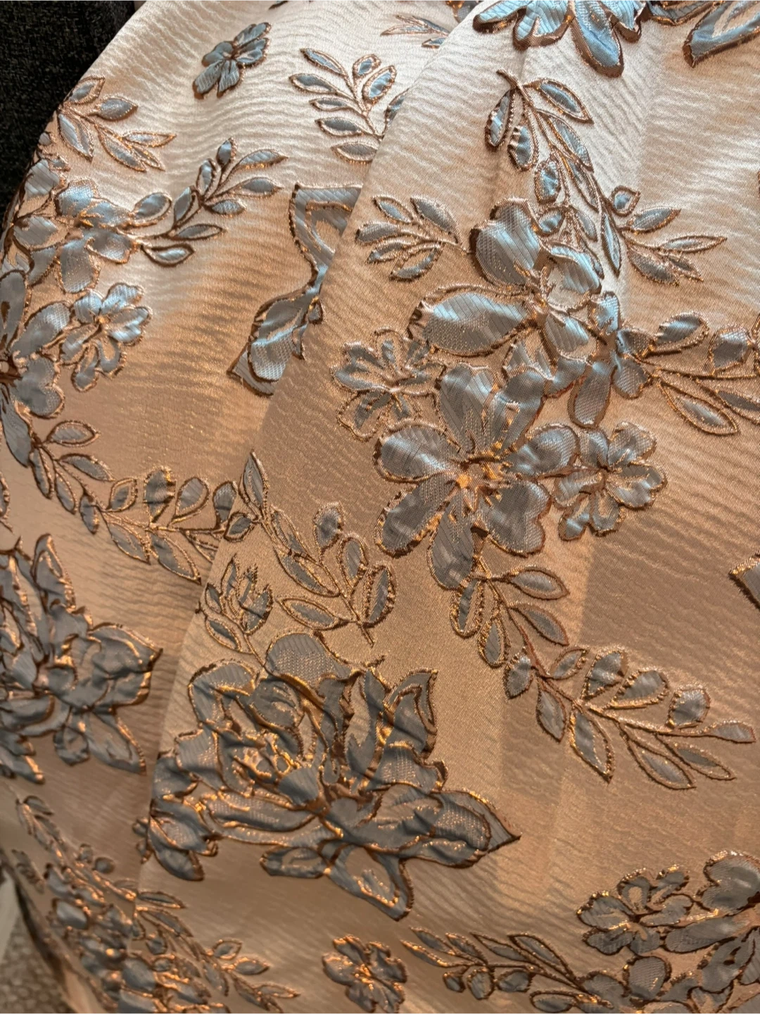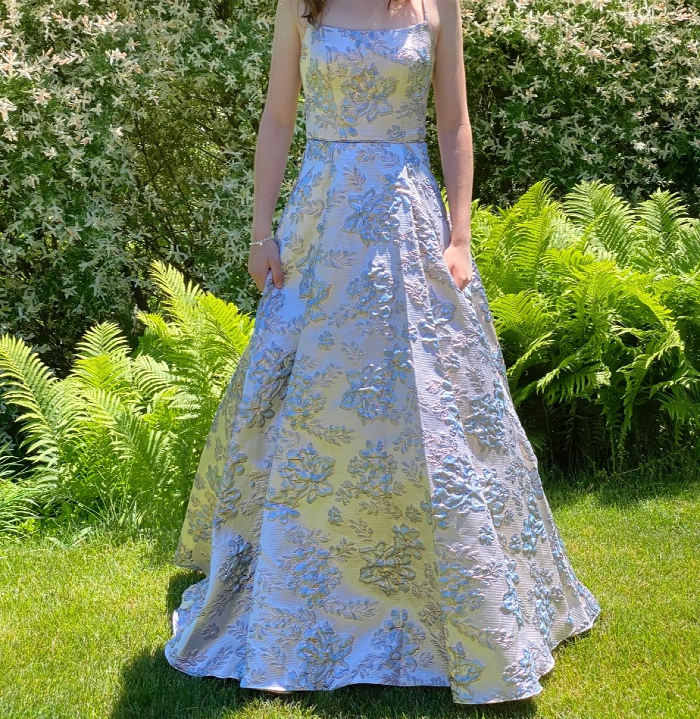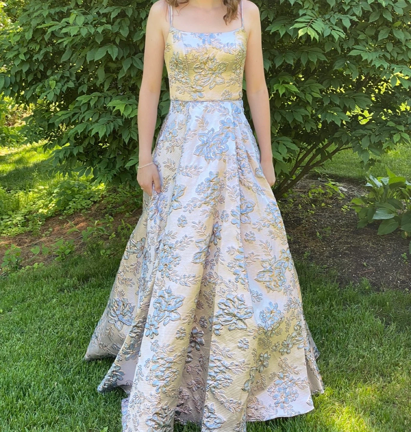 Worn once for photos only. Elegant floor-length formal gown featuring a beautiful brocade floral pattern. It's designed with a flattering silhouette and thin spaghetti straps. Perfect for special occasions like proms or weddings!