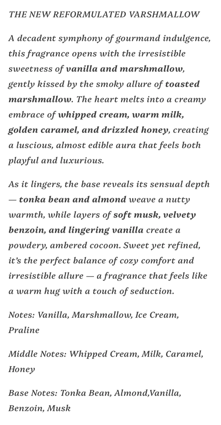887Selling a bottle of E Beauty Collection Varshmallow Fragrance For Her. This is the Eau De Parfum version and contains 100ml. It's a decadent symphony of gourmand indulgence, with notes of vanilla, marshmallow, ice cream, and praline. The base reveals its sensual depth with tonka bean, almond, vanilla, benzoin, and musk